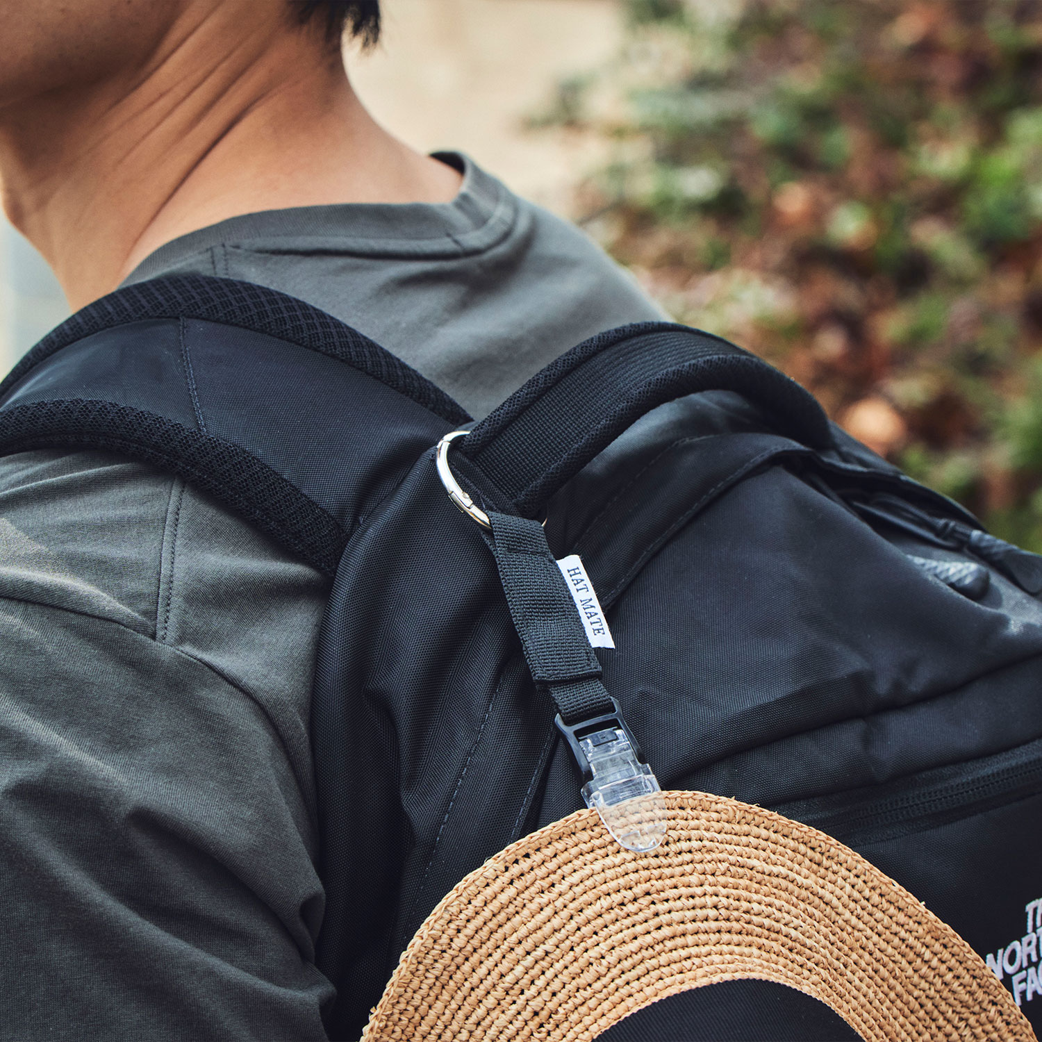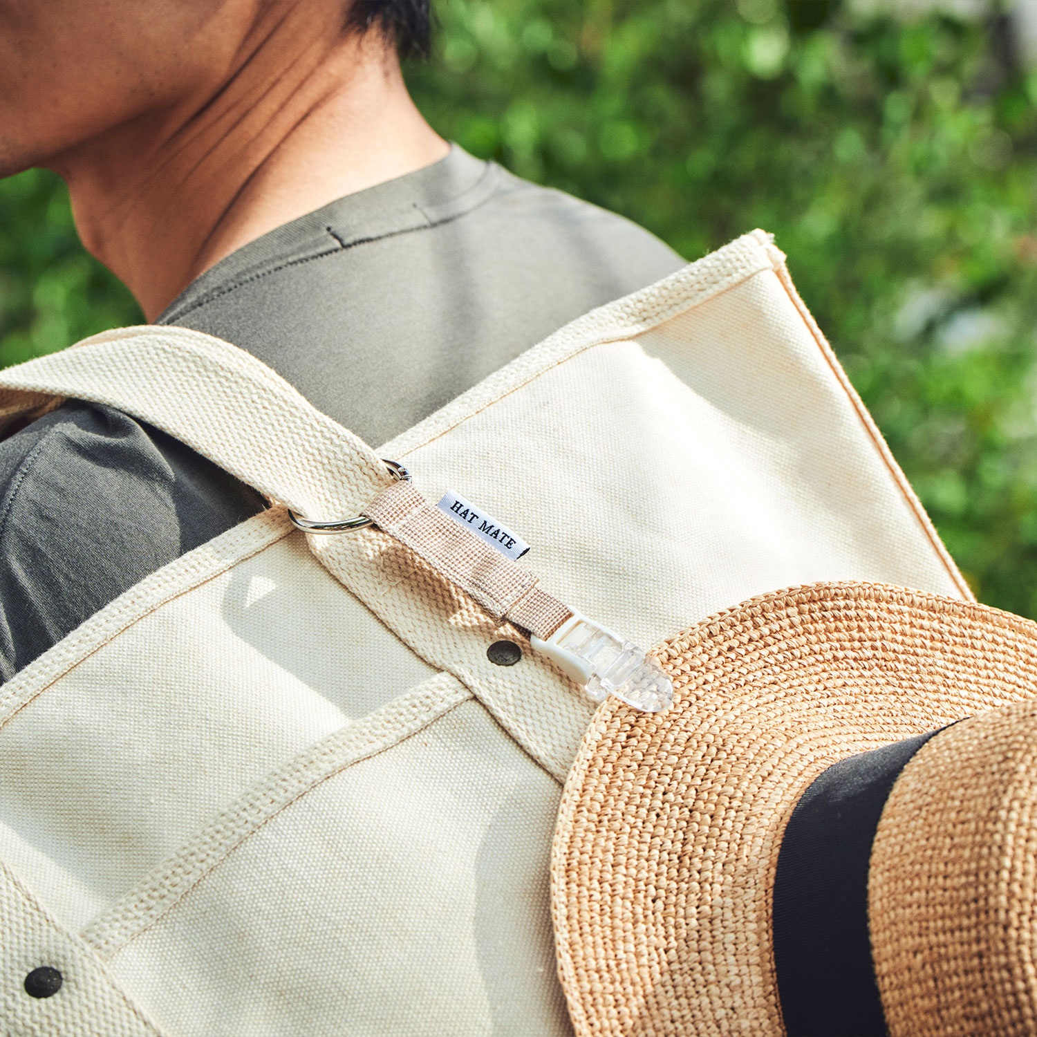 クリップは、片側が1枚歯、もう片側が2枚歯の構造になっています。1枚歯は帽子にやさしく接し、型崩れや傷みを防ぎます。2枚歯はしっかり支えて、横揺れや縦の振動でも帽子が落ちにくく安定します。片側だけで強く挟むより、力を分散して安定させる構造になっているため、帽子を傷めずにバッグやリュックに取り付けて持ち運べます。さらに、「HAT MATE」のタグが右側にくるように装着すると、より帽子を傷つけにくく安心です。
