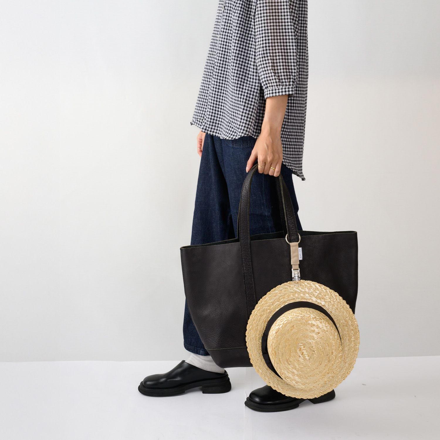 取り付けるバッグの持ち手が太い場合など、大きさが合わない時にも安心。丸カラビナは市販のものに簡単に付け替えられるため、用途や好みに合わせて調整できます。