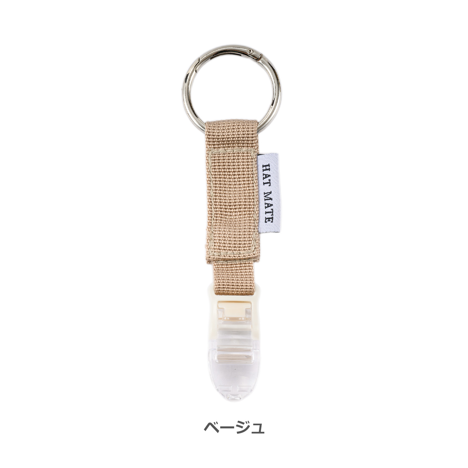 バッグやリュックに取り付ける部分は内径38mmの大きな丸形カラビナを使用しています。リュックの取っ手やトートのハンドルなど幅広にも対応可能。また、帽子を挟むクリップは国内有数のクリップメーカーが作る日本製クリップを使用しています。揺れや振動に強く、クリップの歯で帽子を傷つけないように工夫した作りになっているのも安心です。しかも、市販のものより大サイズで、より奥までしっかりと挟み込めるクリップを採用しています。