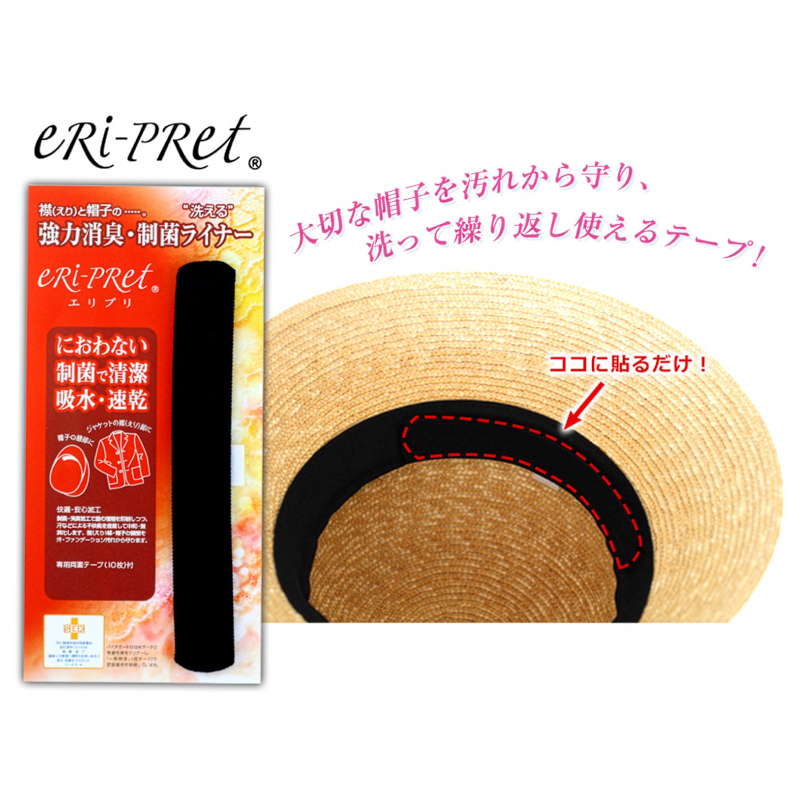 <商品情報> 大切な帽子の汗シミ防止に大活躍の後付けテープ帽子の内側(額部分)にテープを張ることで汗シミやファンデーションの汚れから帽子を守り、しかも消臭してくれる便利な消臭・制菌ライナーです。 <詳細> エリプリ 帽子の汚れ 襟汚れ防止テープ(麦わら帽子 ストローハット 帽子 ケア メンテナンス ファンデ 消臭 抗菌)/田中帽子店