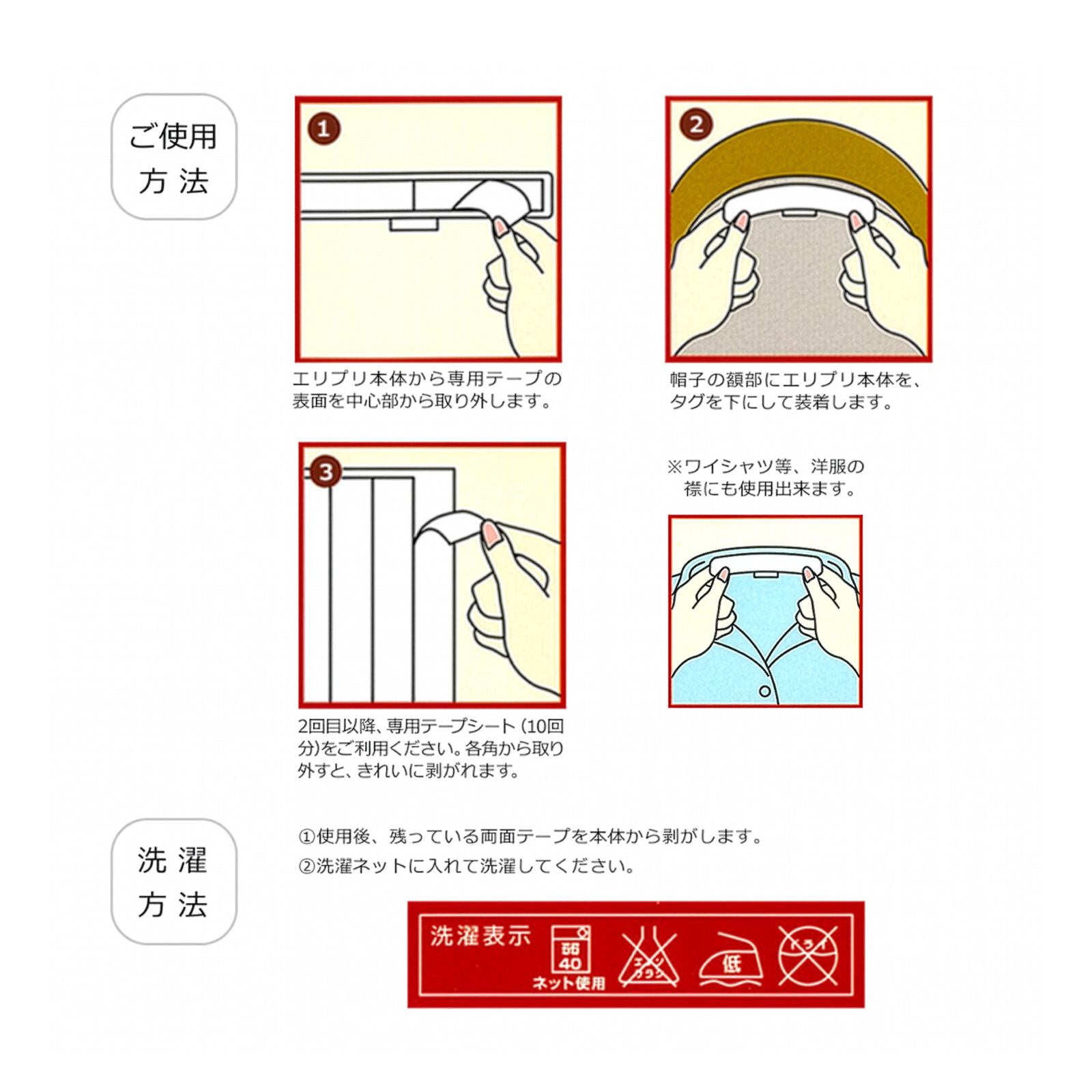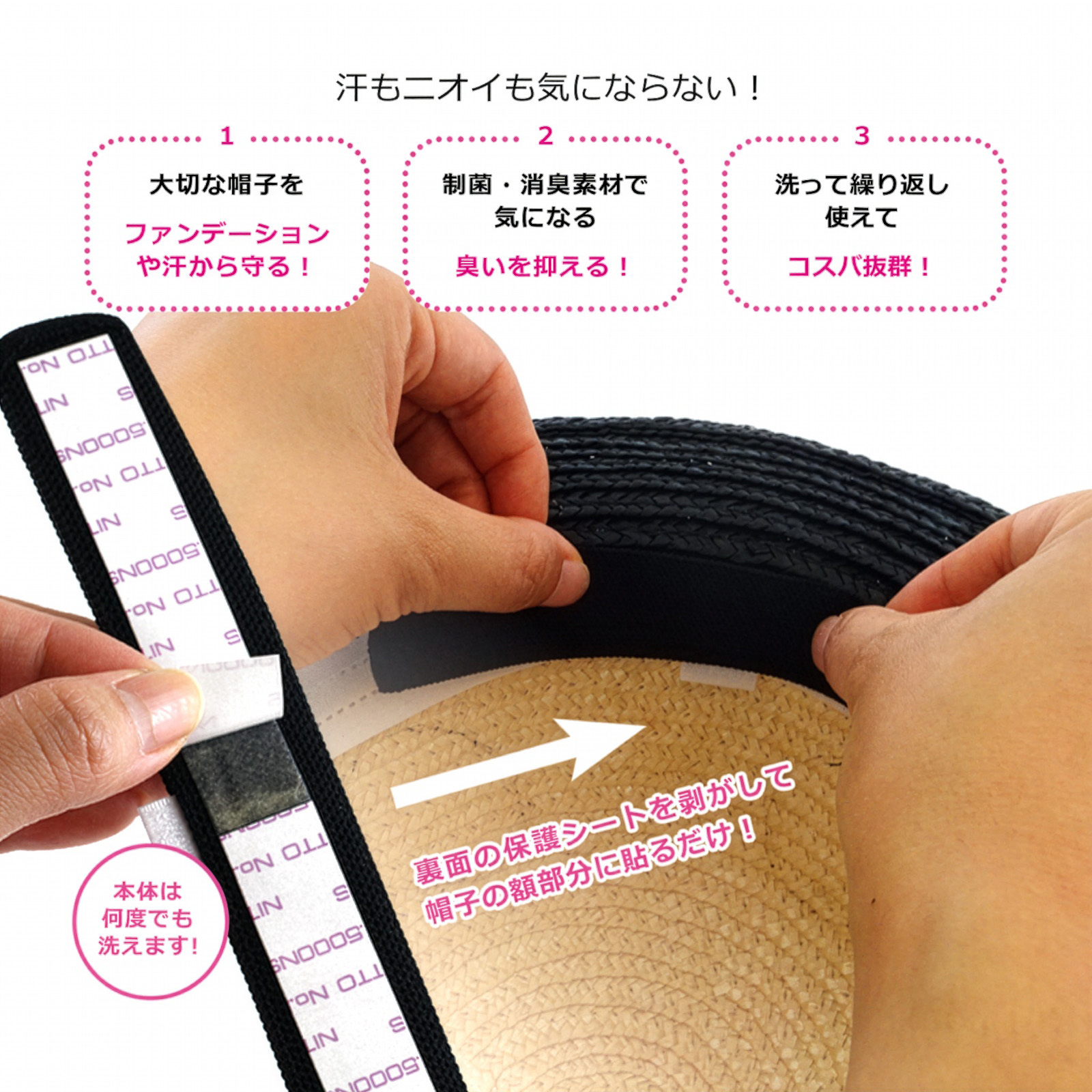 帽子の汚れ・襟汚れ防止テープ 帽子やキャップの汗止めや襟などを汗染みやよごれからしっかり守る衣類ケアアイテムです。