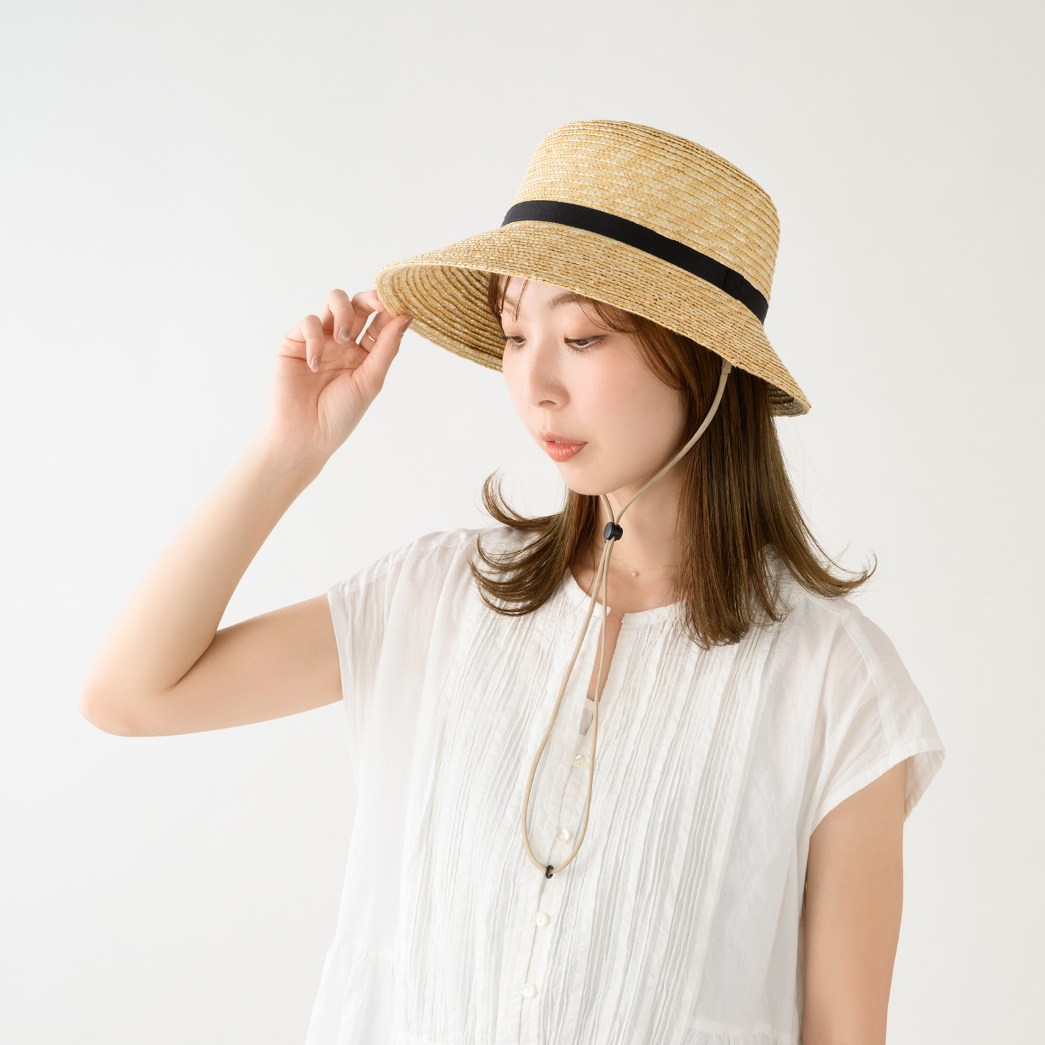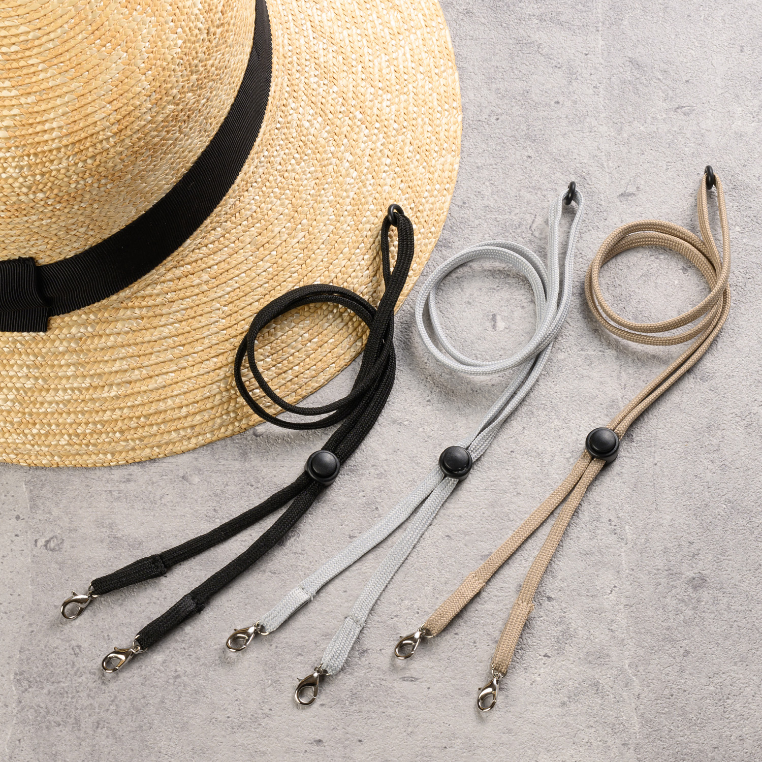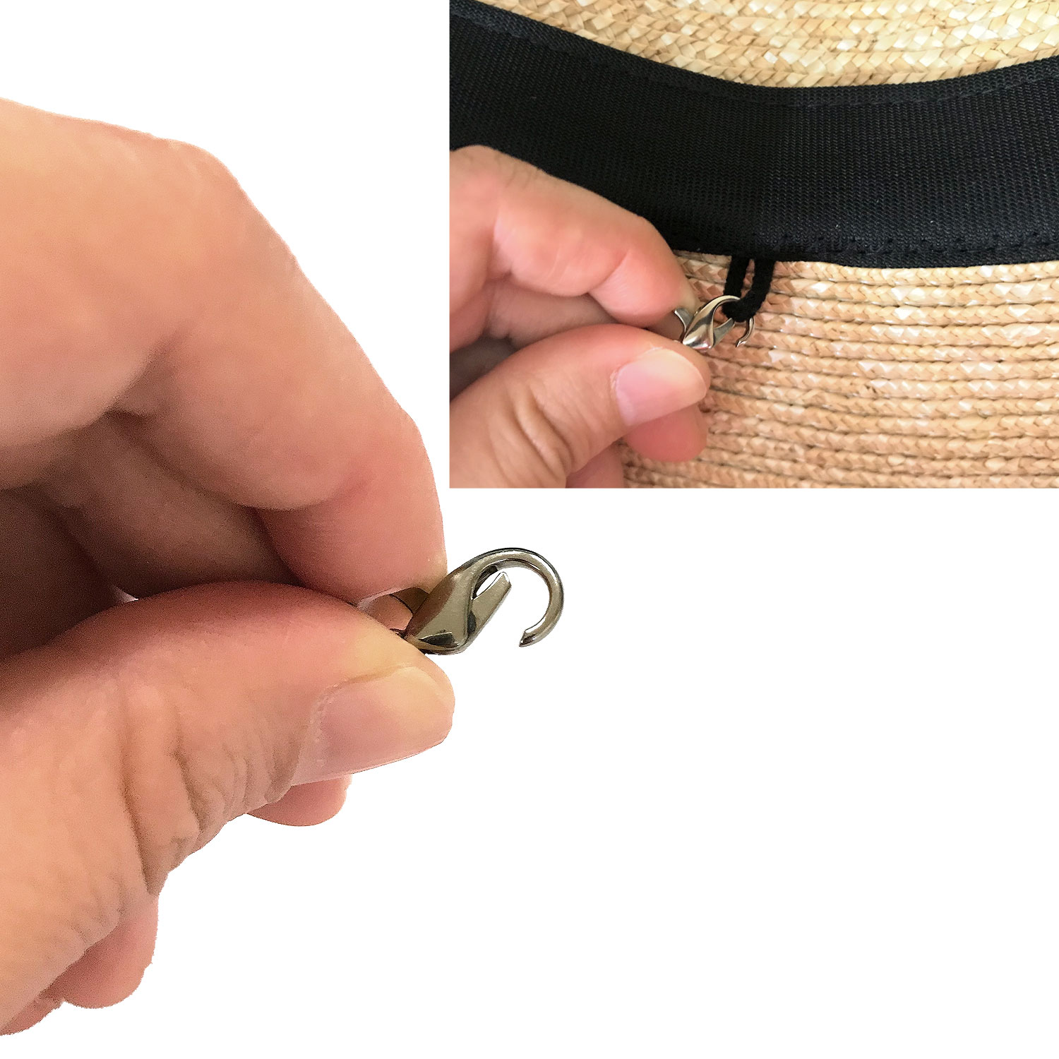 <商品情報> 風飛び防止用の帽子ストラップ(あご紐)風が強い場所に行ったときや乗り物に乗ったとき、または天候で風が強い日など帽子の風飛びは悩みの種です。しかも、市販のストラップはプラスチック製のカラビナのものが多く、柔らかい素材のループにプラスチックのカラビナはなかなか装着することができません。