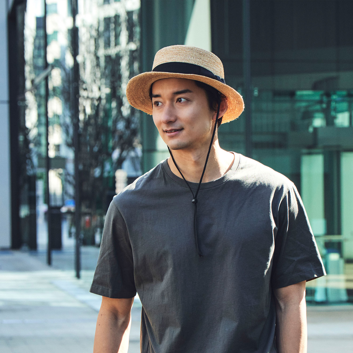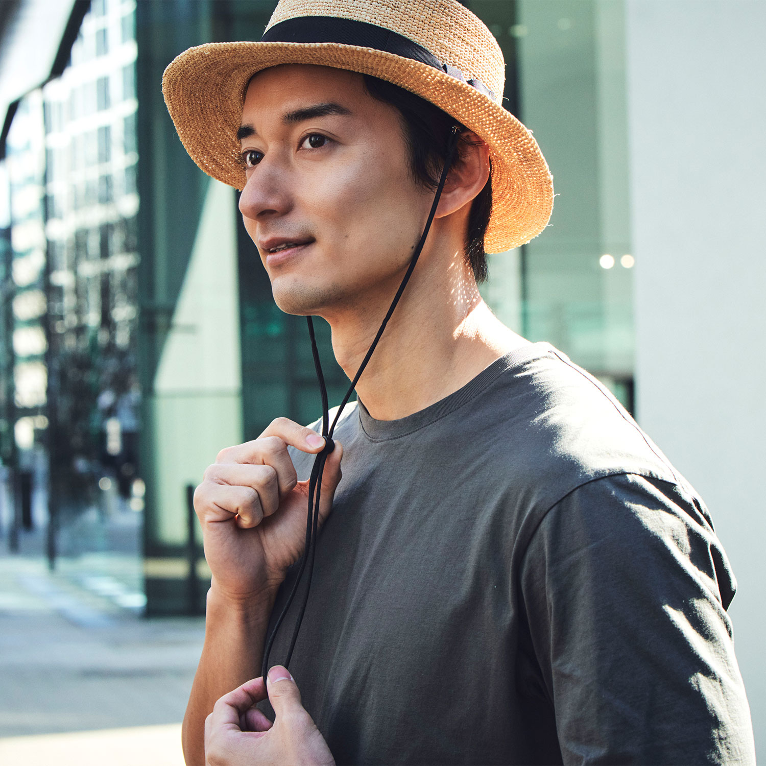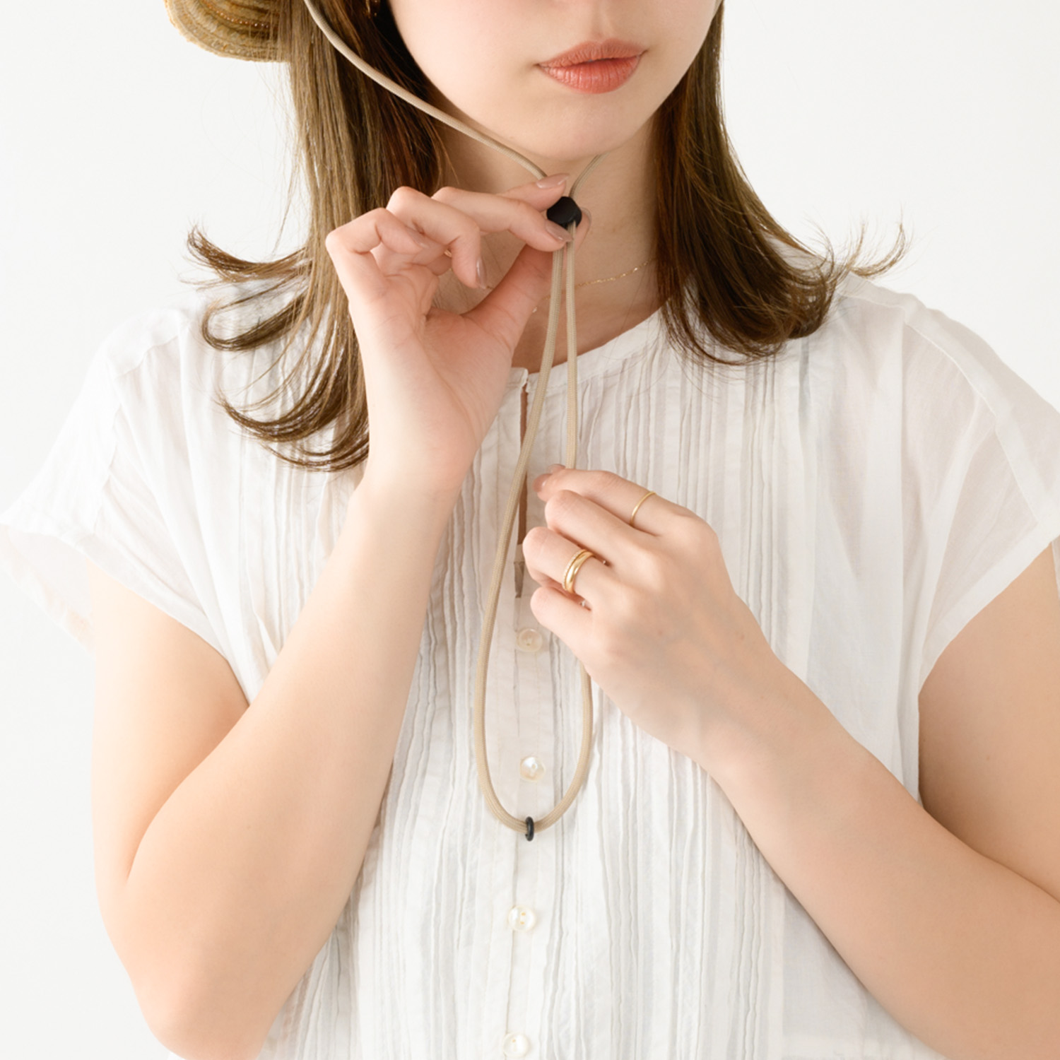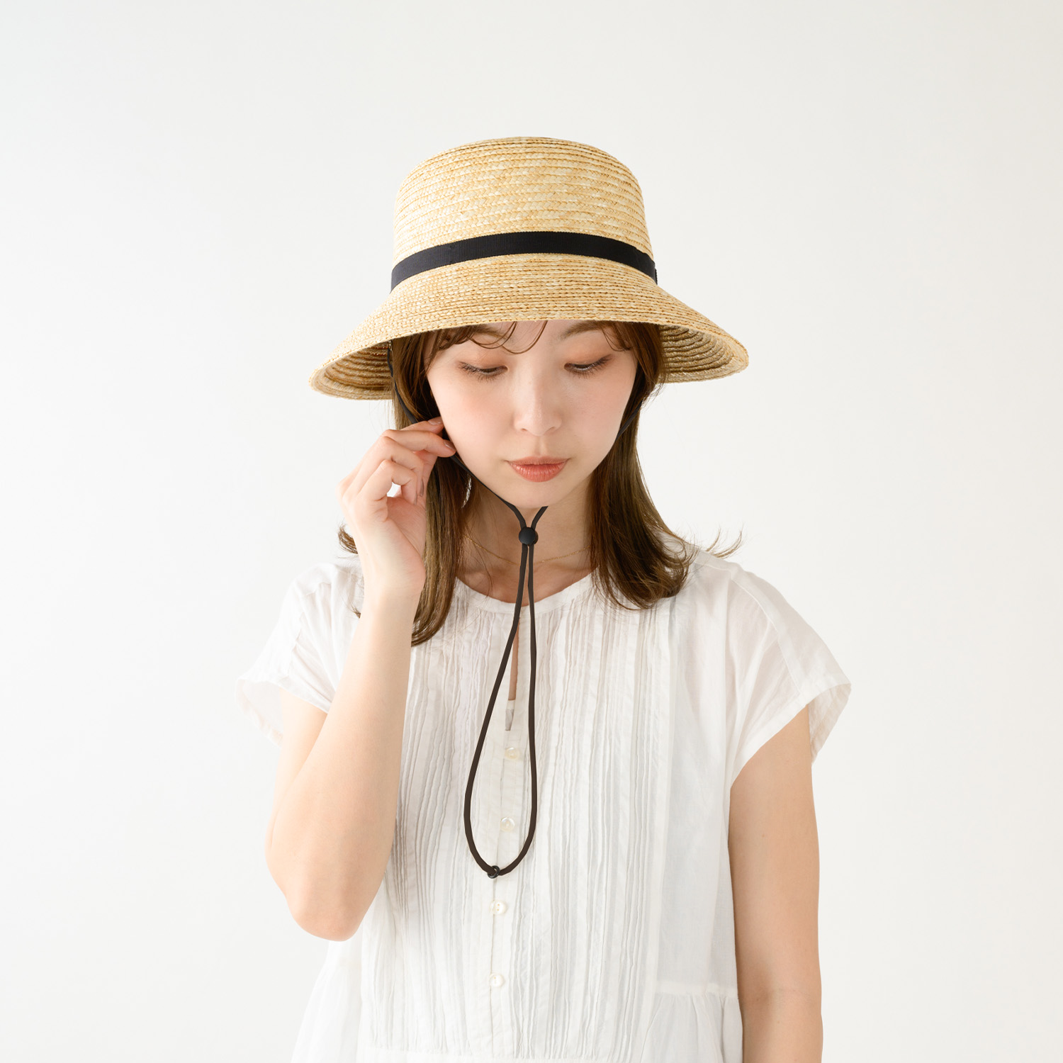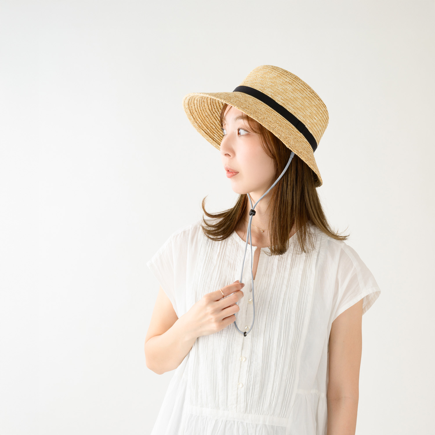 帽子についている付属のループに簡単に装着が出来るストラップ(あご紐)です。紐自体はふんわりとした伸縮性のある素材で、締めたときに食い込んでも痛くありません。