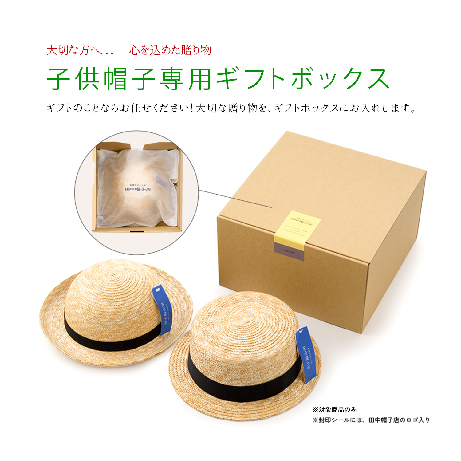 贈り物に、特別なギフトボックスをご用意しました。こども用帽子専用の有料ギフトボックスは、シンプルなデザイン。封印シールには、田中帽子店のロゴ入りです。誕生日や記念日の贈り物にぜひご利用ください。