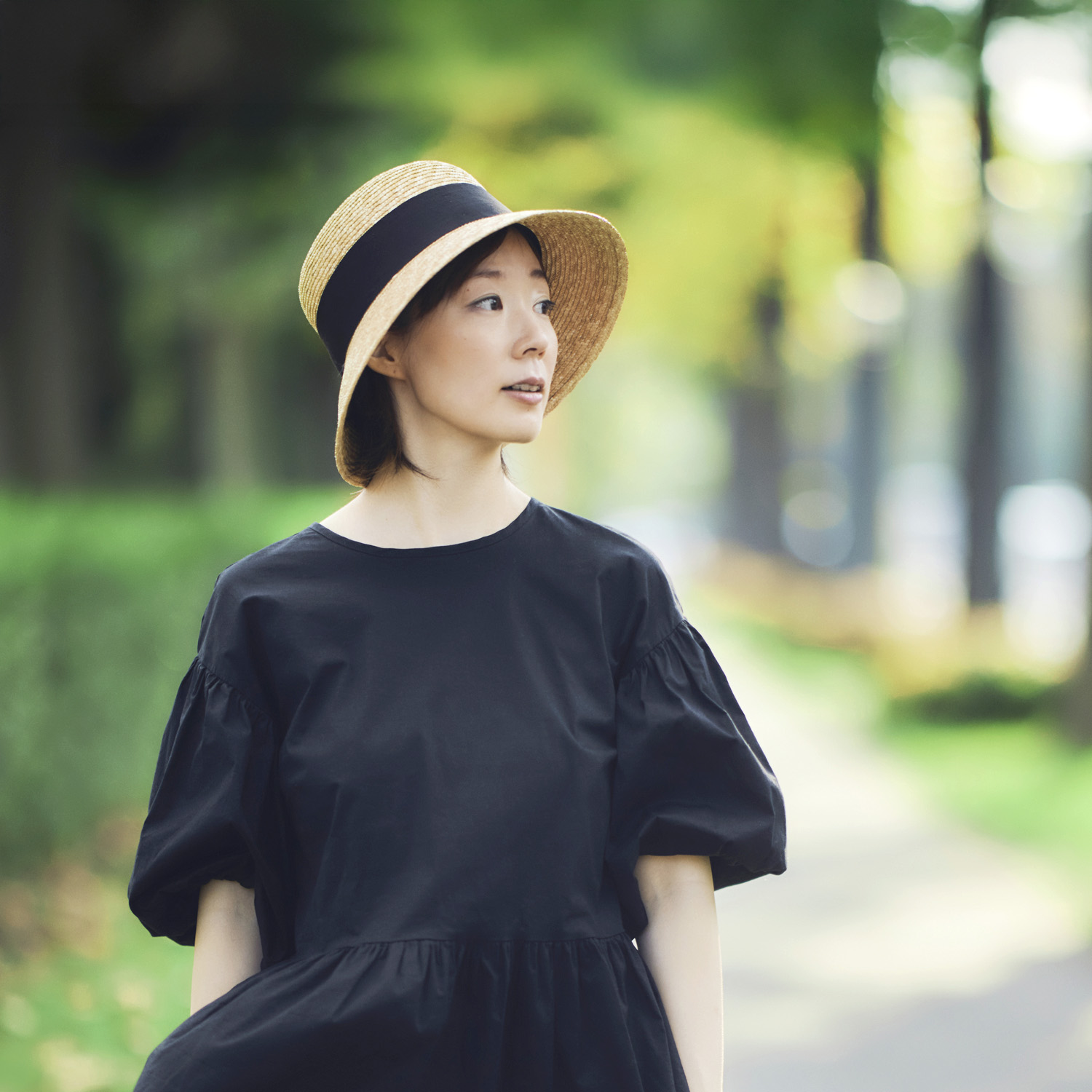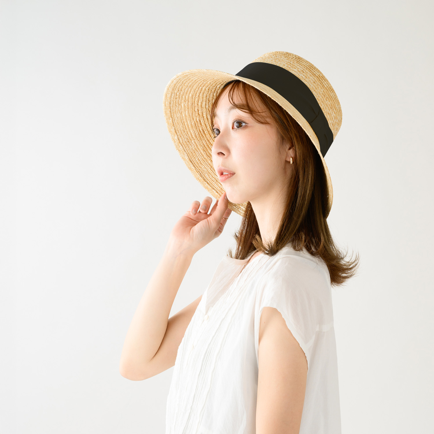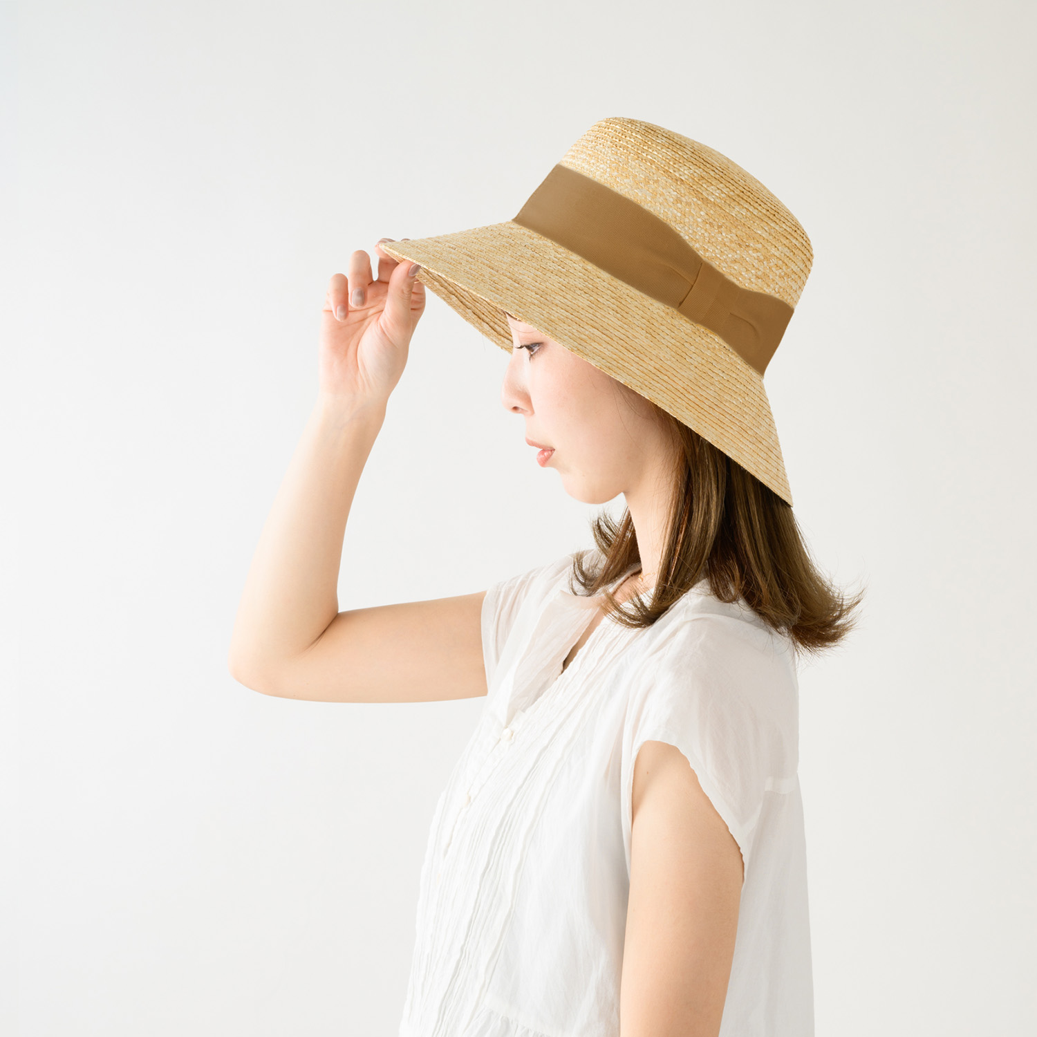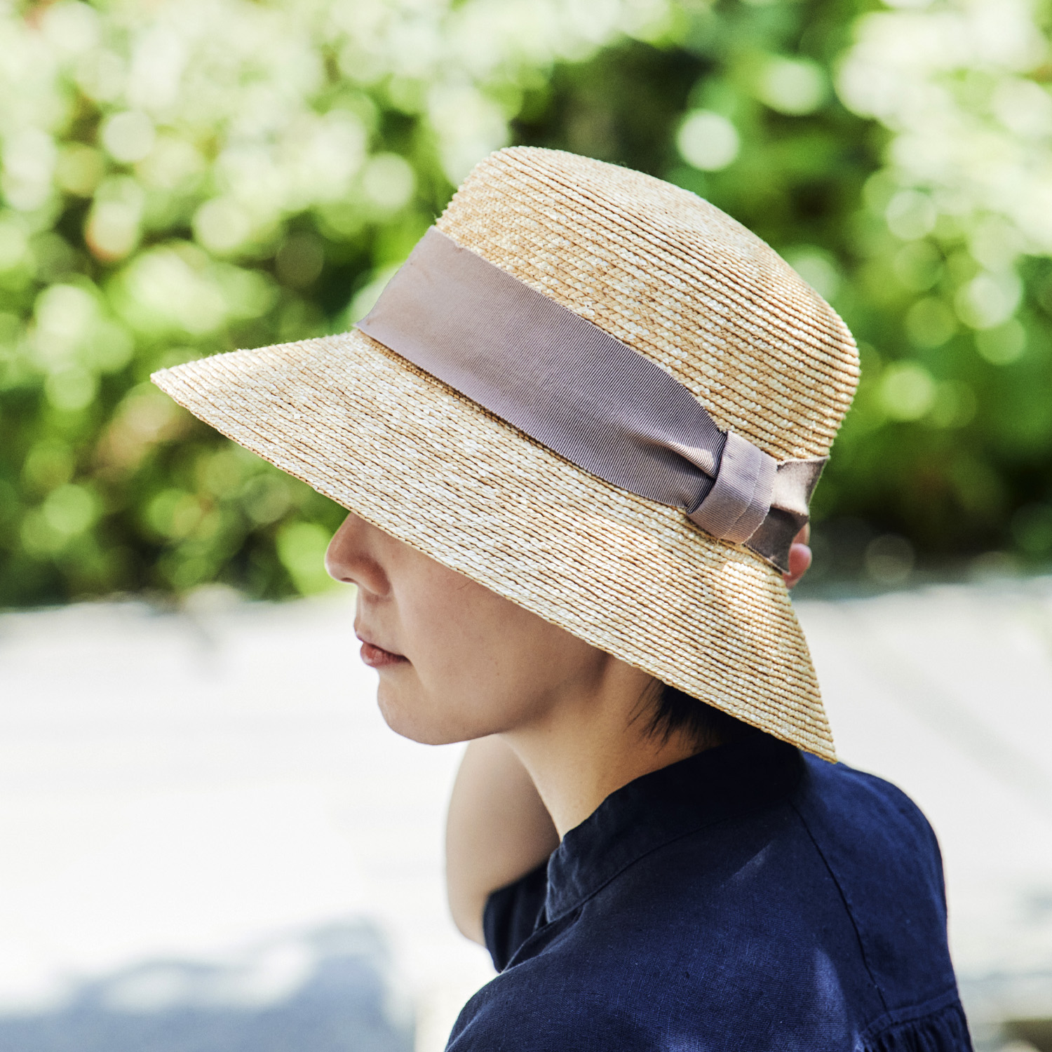 シンプルな太めなリボンはサイドをキュッと絞ってアクセントに。上品なデザインでどなたでもかぶりやすいデザイン。長めのつばは、首筋にもしっかり影を落とします。