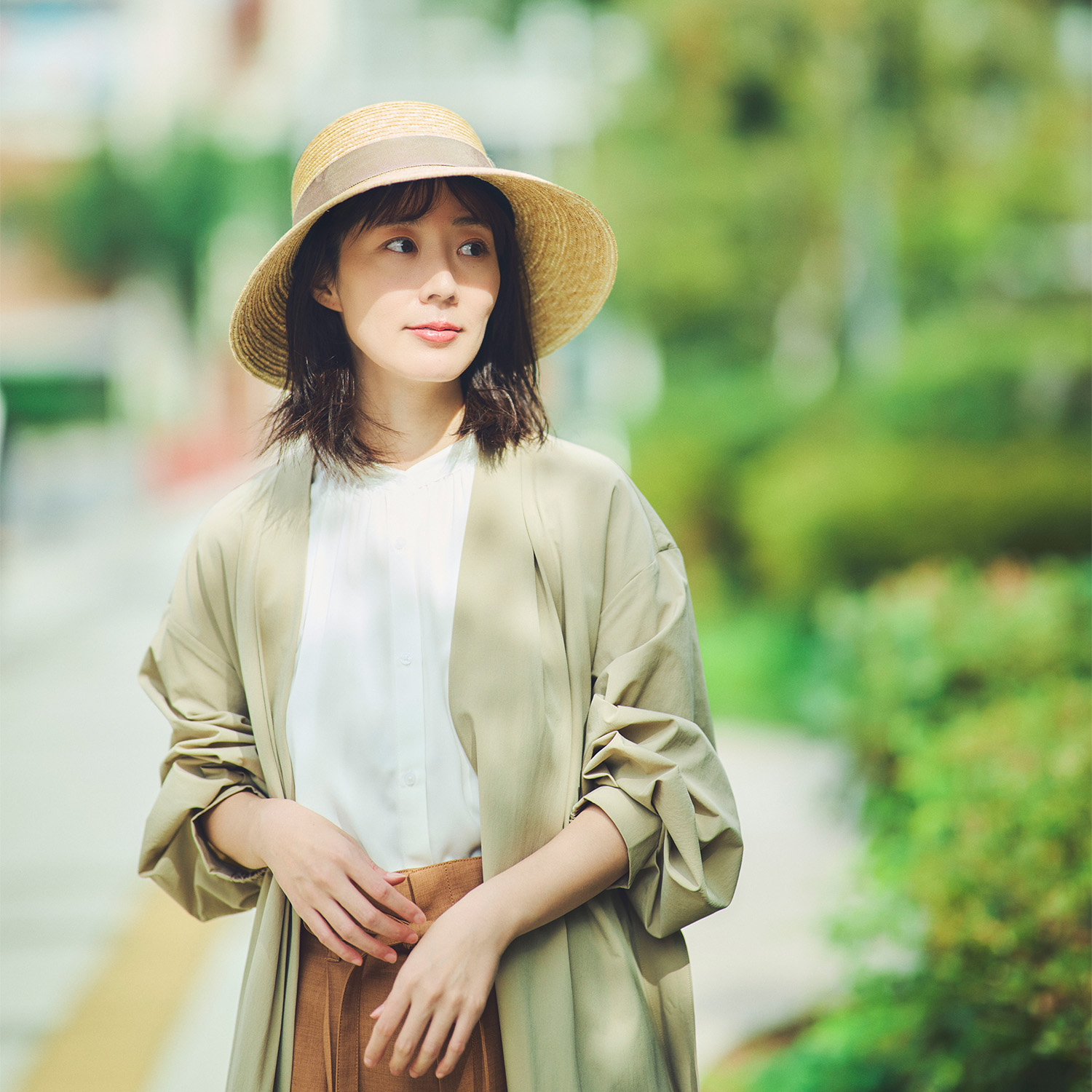 婦人用で人気の高いのが全体的につばの長い女優帽。本モデルは、さらに前つばを長くして前後差を付けたデザインです。今まで以上に顔を日差しからしっかりと守り、女性をエレガントに魅せるシルエットにしました。
