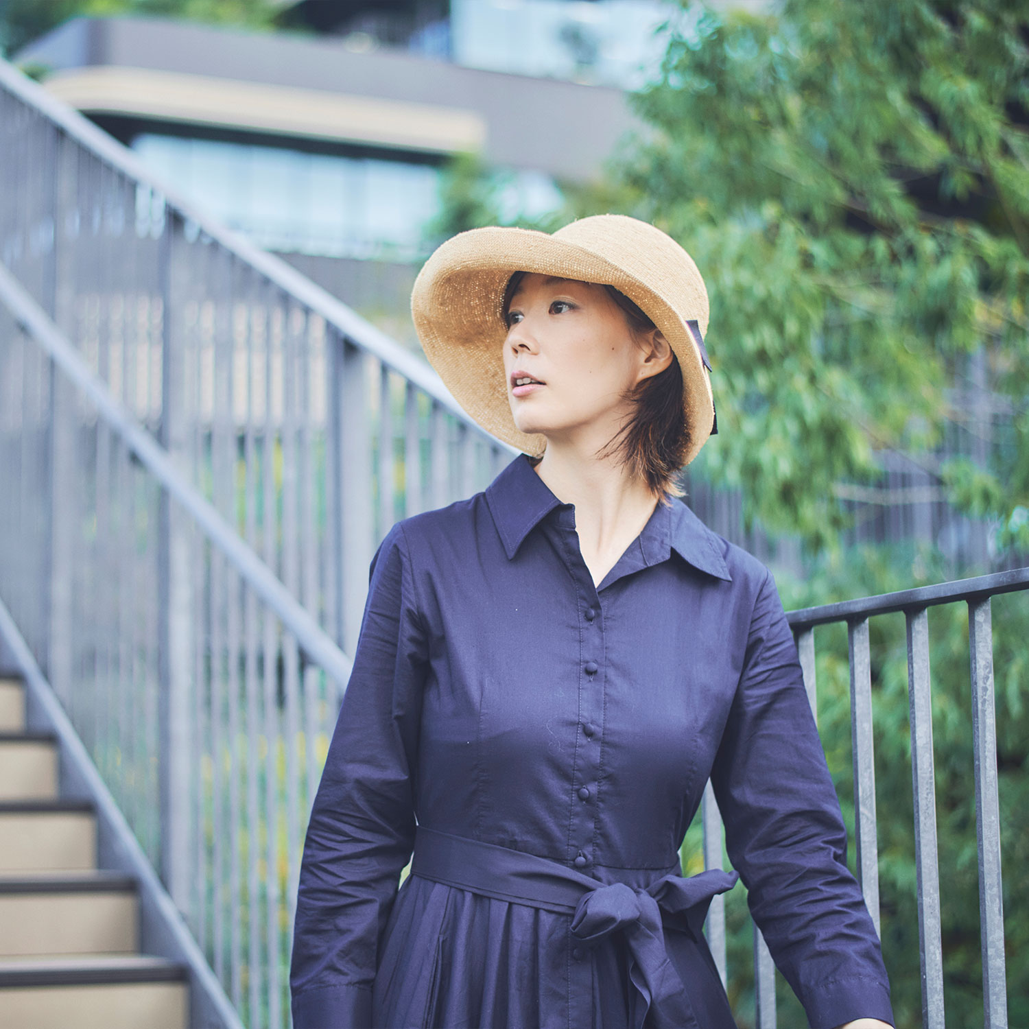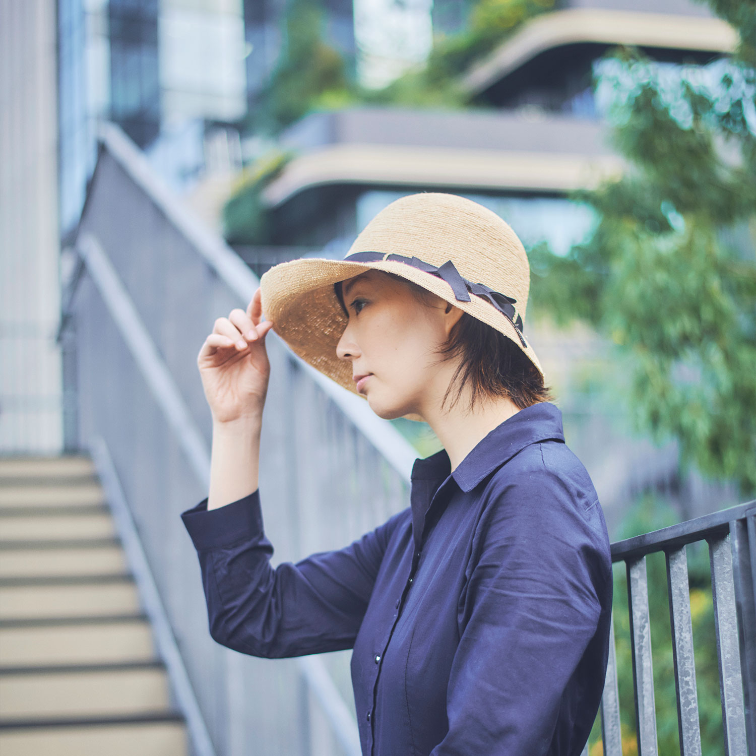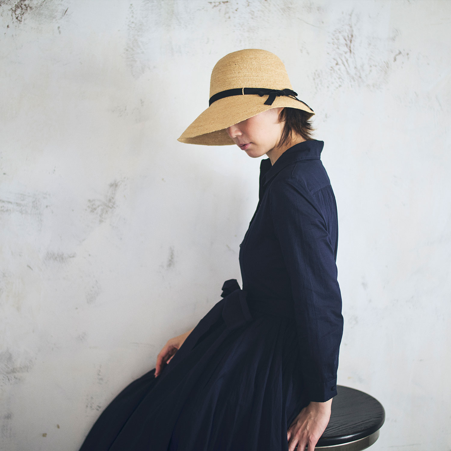 ラフィアとは、マダガスカル原産の「ラフィア椰子」の葉を加工した天然素材です。その繊維から作られる紐を編んだ素材から帽子を作っています。使うほど手に馴染み肌触りもやさしくなっていきます。