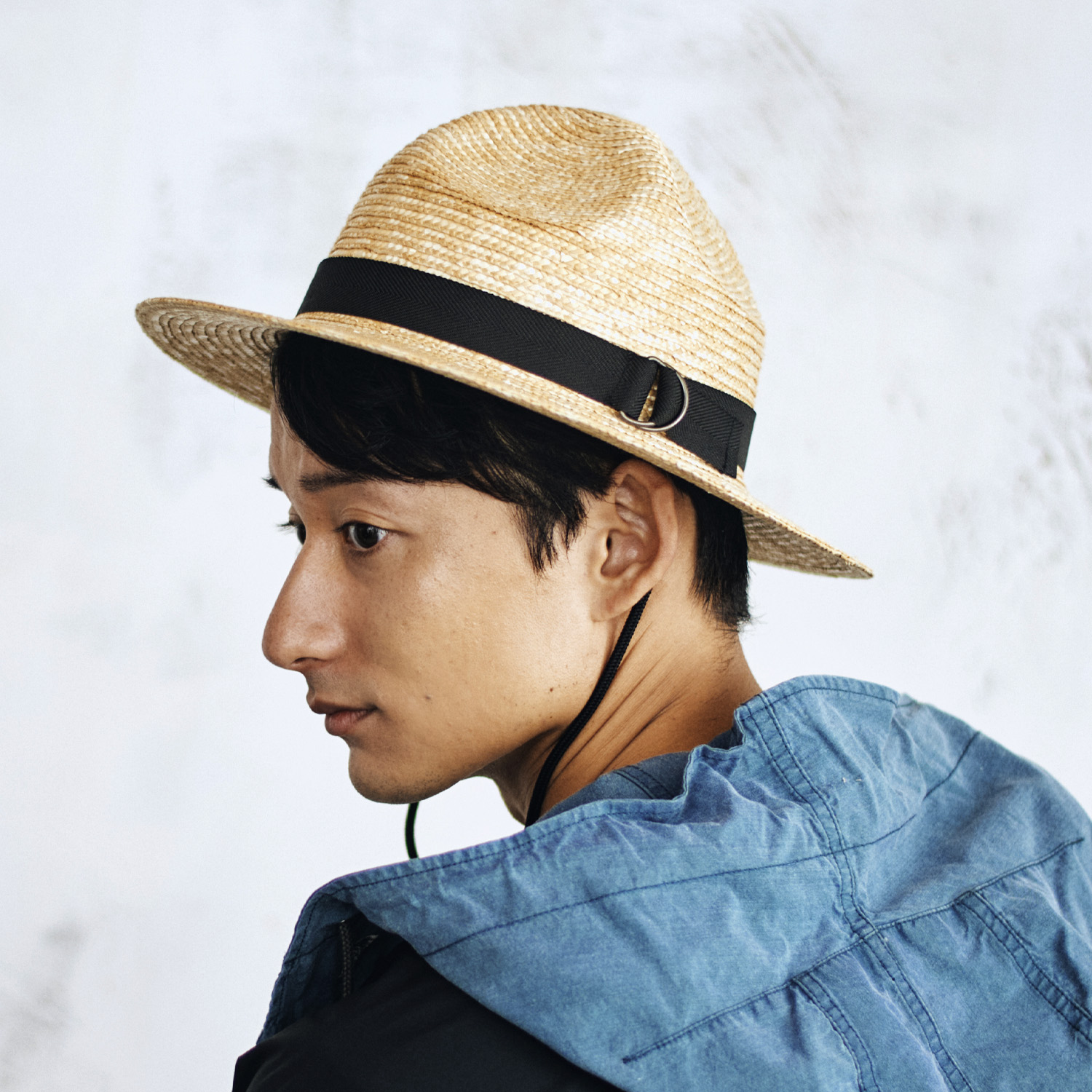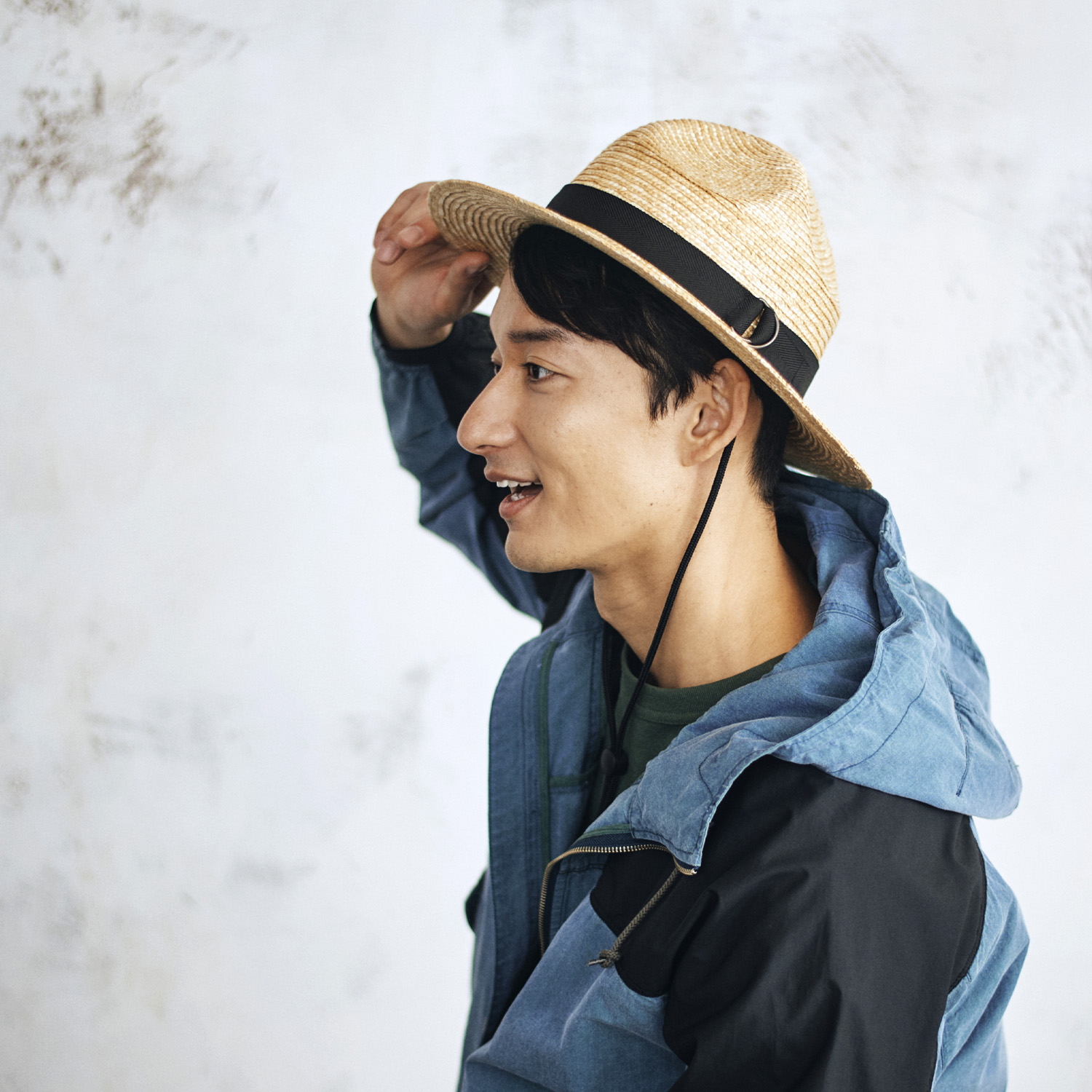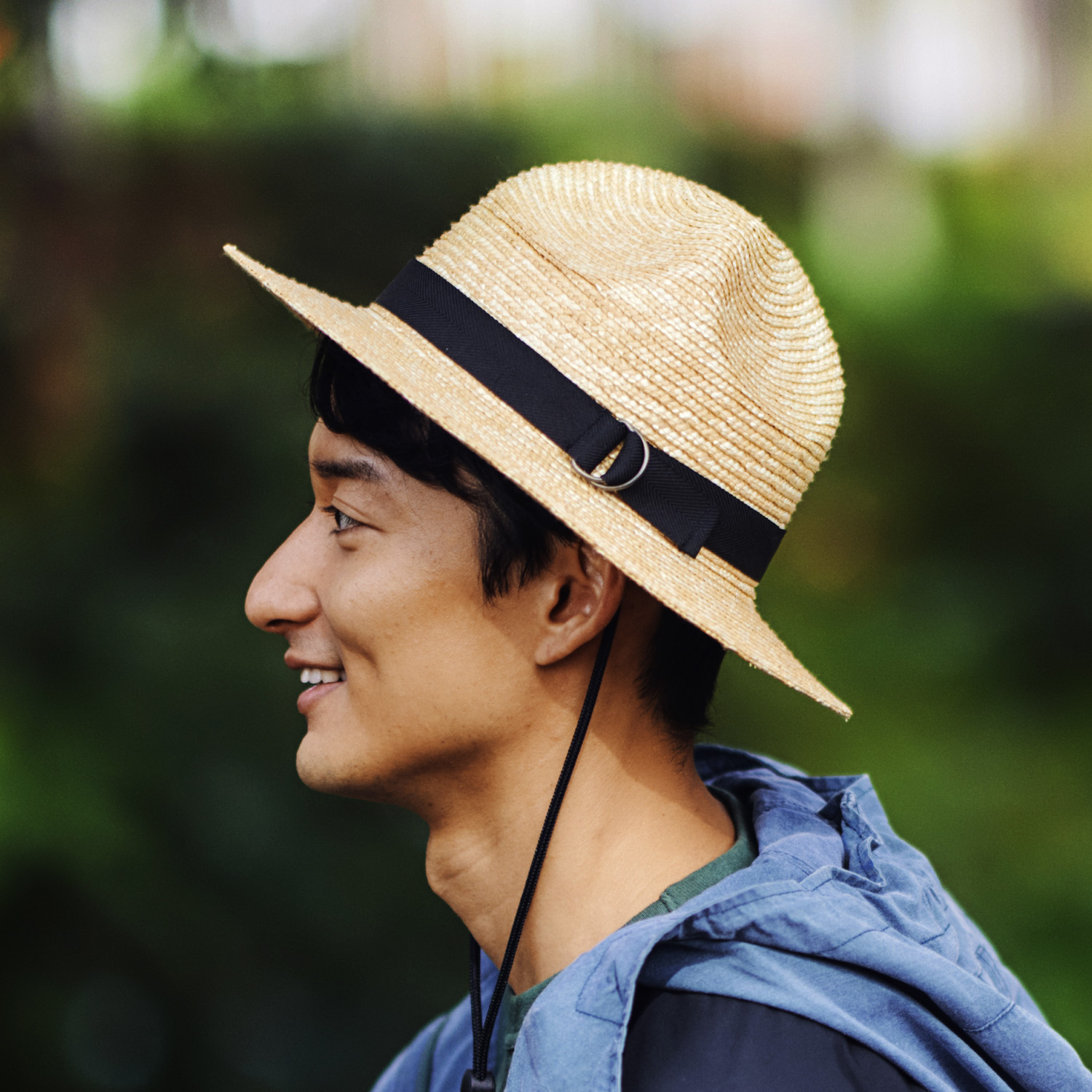 通常、冬物のウールフェルトで作られることの多いマウンテンハットを麦わらの素材で作りました。 少しアウトドアテイストを盛り込んだ装飾で、リサイクルポリエステルを使ったテープにブラックニッケルの二重リングでベルトのように留めたリボンのデザインです。 つばも少し長めで日除け効果もあり、あご紐は最初から縫い付けでついているのでトレッキングやアウトドアにも最適です。 もちろん、街中のカジュアルスタイルにもマッチするようにクラウン部分の山部分は適度な高さにしてあります。