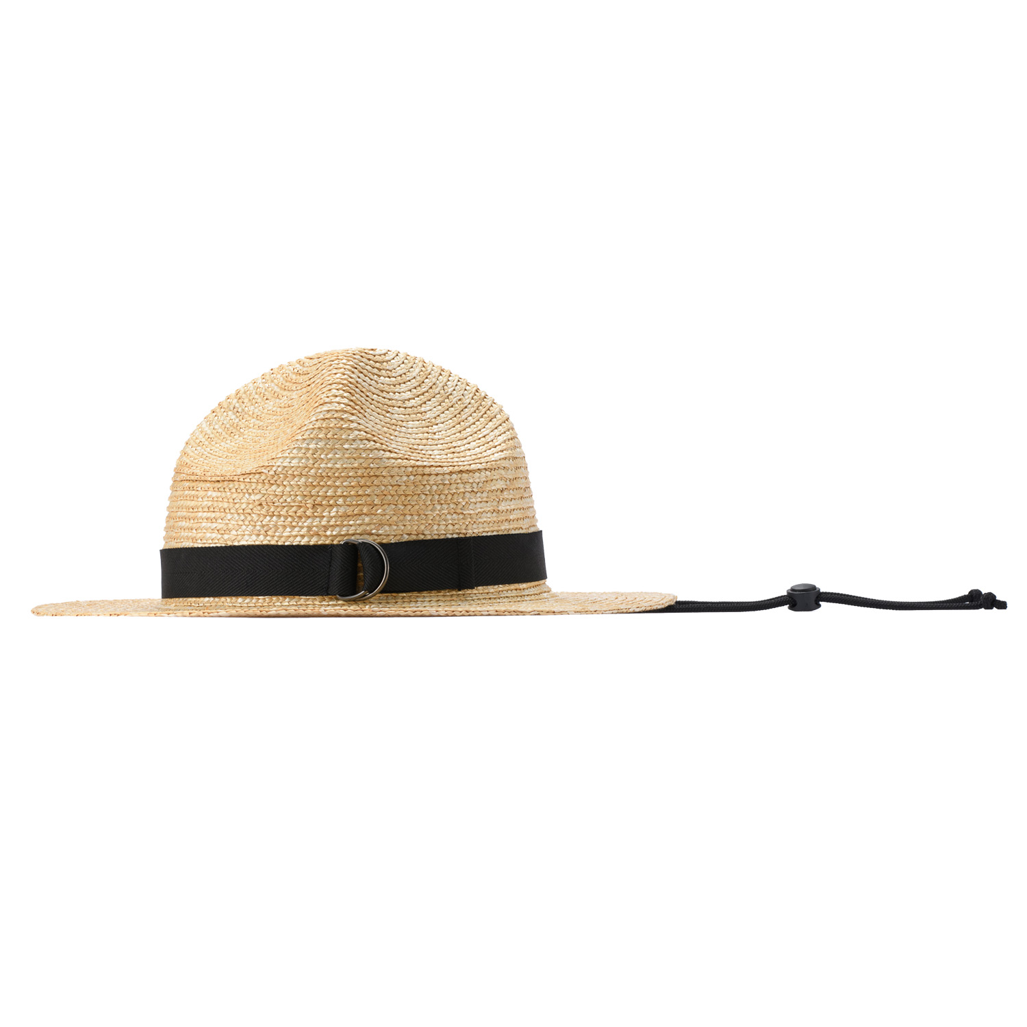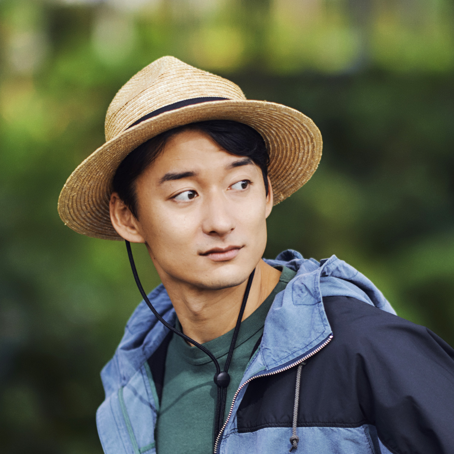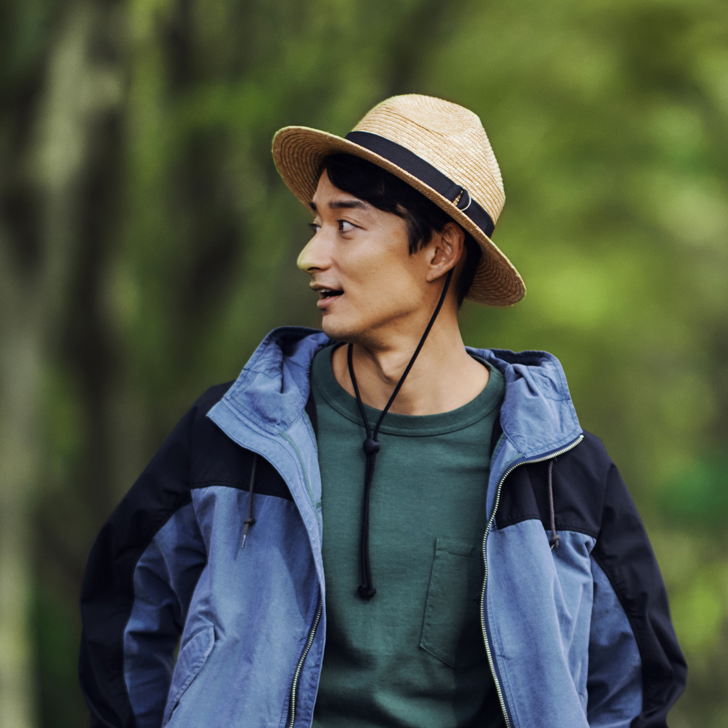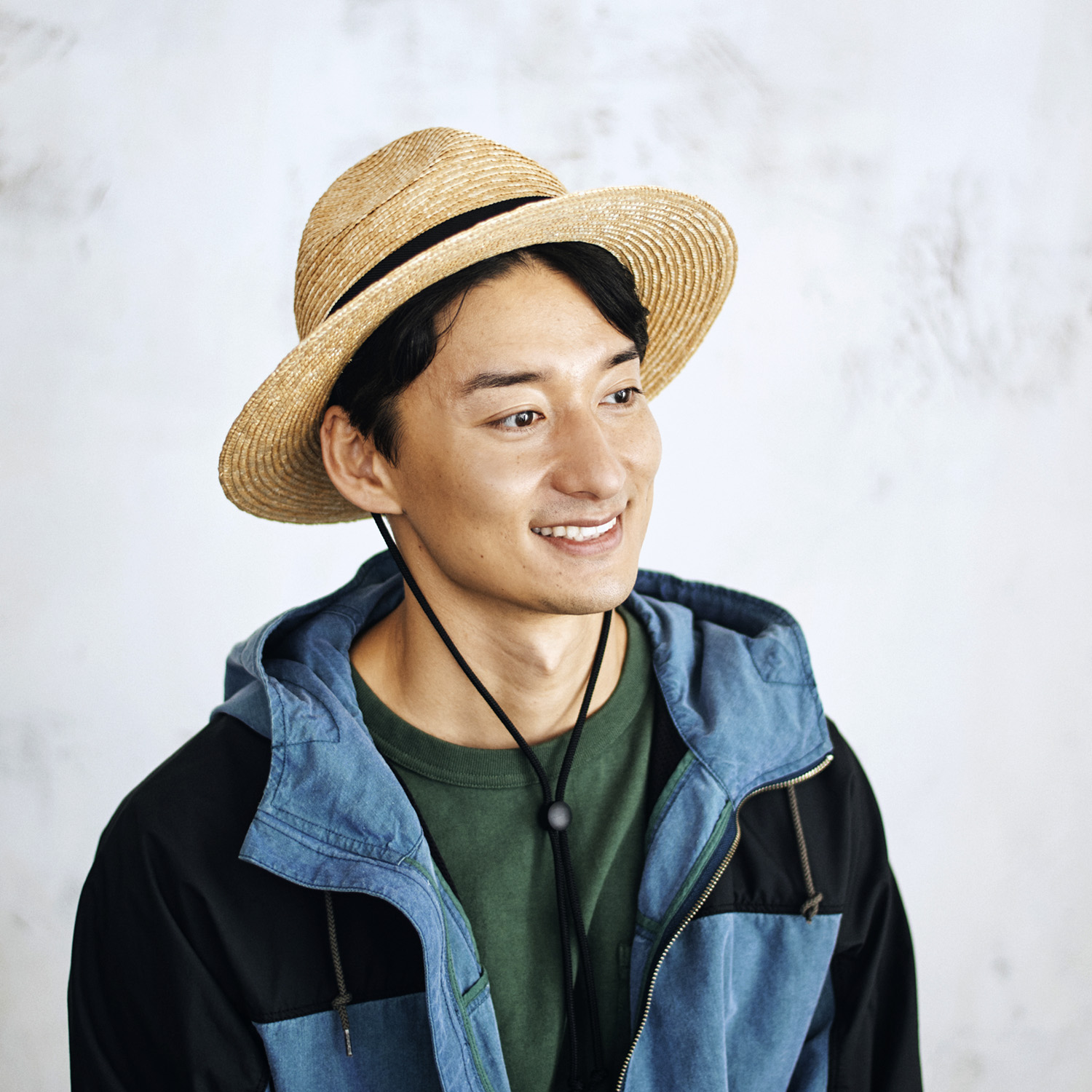 通常、冬物のウールフェルトで作られることの多いマウンテンハットを麦わらの素材で作りました。 少しアウトドアテイストを盛り込んだ装飾で、リサイクルポリエステルを使ったテープにブラックニッケルの二重リングでベルトのように留めたリボンのデザインです。 つばも少し長めで日除け効果もあり、あご紐は最初から縫い付けでついているのでトレッキングやアウトドアにも最適です。 もちろん、街中のカジュアルスタイルにもマッチするようにクラウン部分の山部分は適度な高さにしてあります。