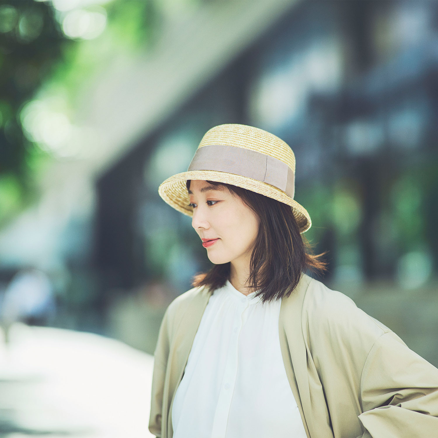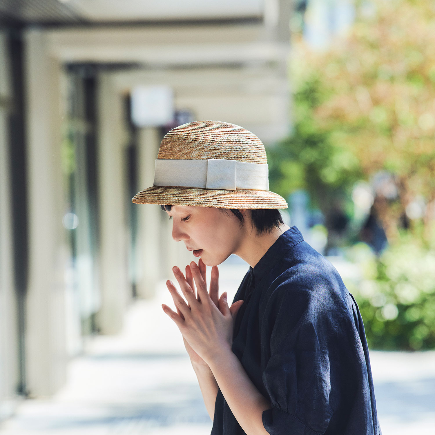 クラウン部分が角丸型で短つばのちょっと小ぶりな麦わら帽子日除けはしたいけれど、つばの長い帽子は苦手という方や、背丈とのバランスで長いつばが似合いにくいと感じている方の声から生まれたのが本製品です。クラウンは大人らしい印象の角丸シルエットに仕上げ、つばは短めながら、やさしく下向きの曲線を描くデザイン。しっかりと細麦を縫い上げた帽体に、5cm幅の綿麻リボンを合わせることで、ナチュラルで落ち着いた雰囲気を演出しています。上品さと気軽さを兼ね備え、日常使いしやすい帽子に仕上がりました。 <商品情報> Ciel シエル 麦わら クロッシェ(麦わら帽子 ストローハット レディース 婦人 つば短め 太リボン 人気 ハット)/田中帽子店