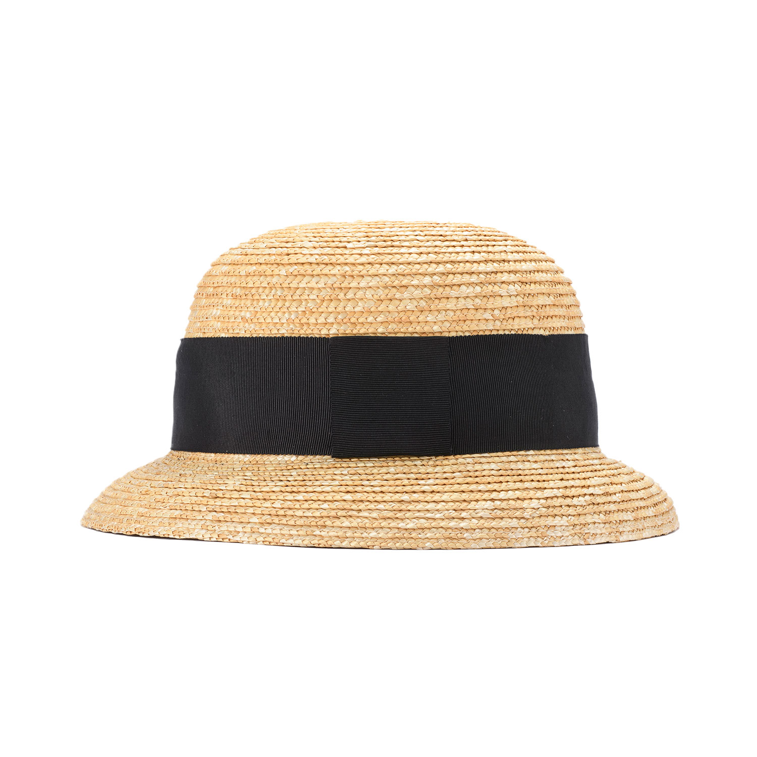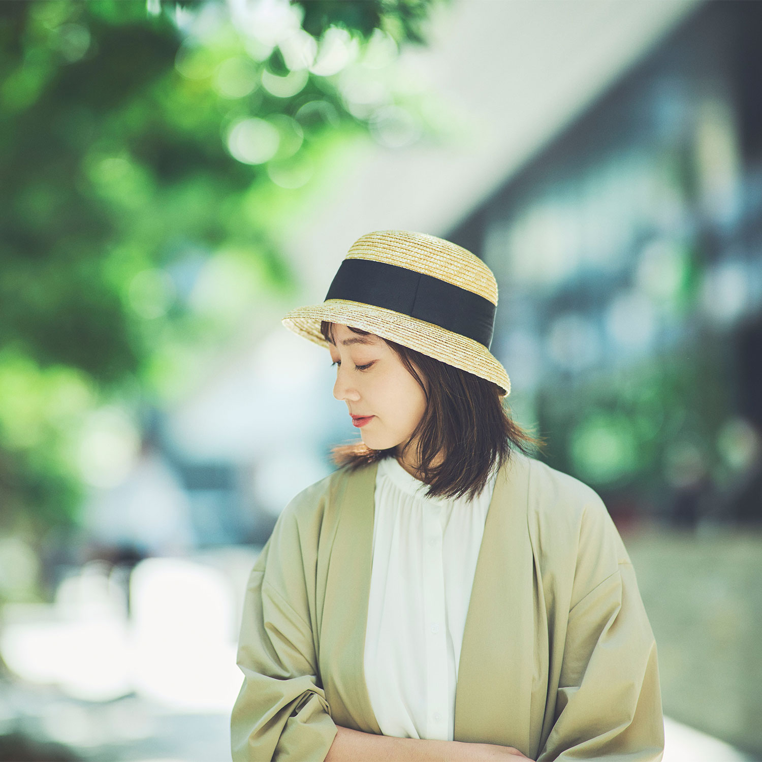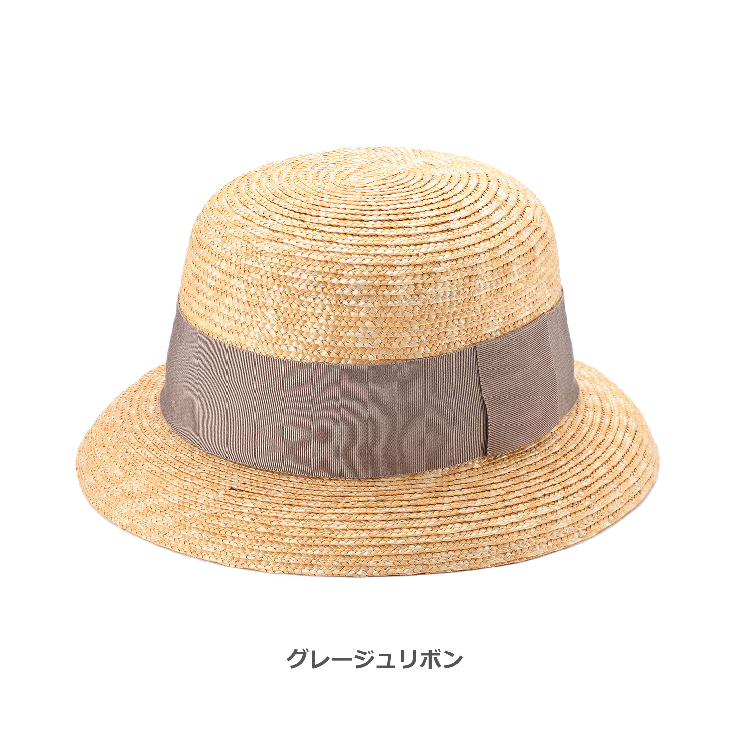 麦わら クロッシェ 太めのリボンがクラシカルな趣きのハット。フレーム効果で小顔に見せるつばのデザイン。