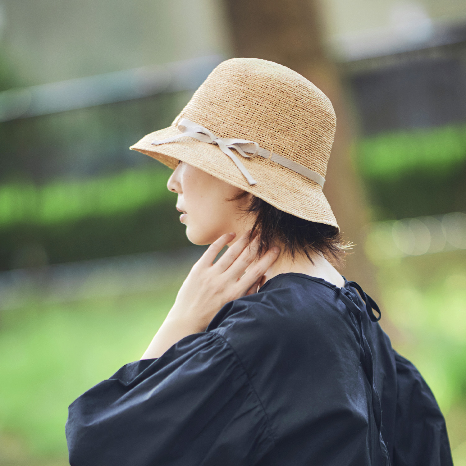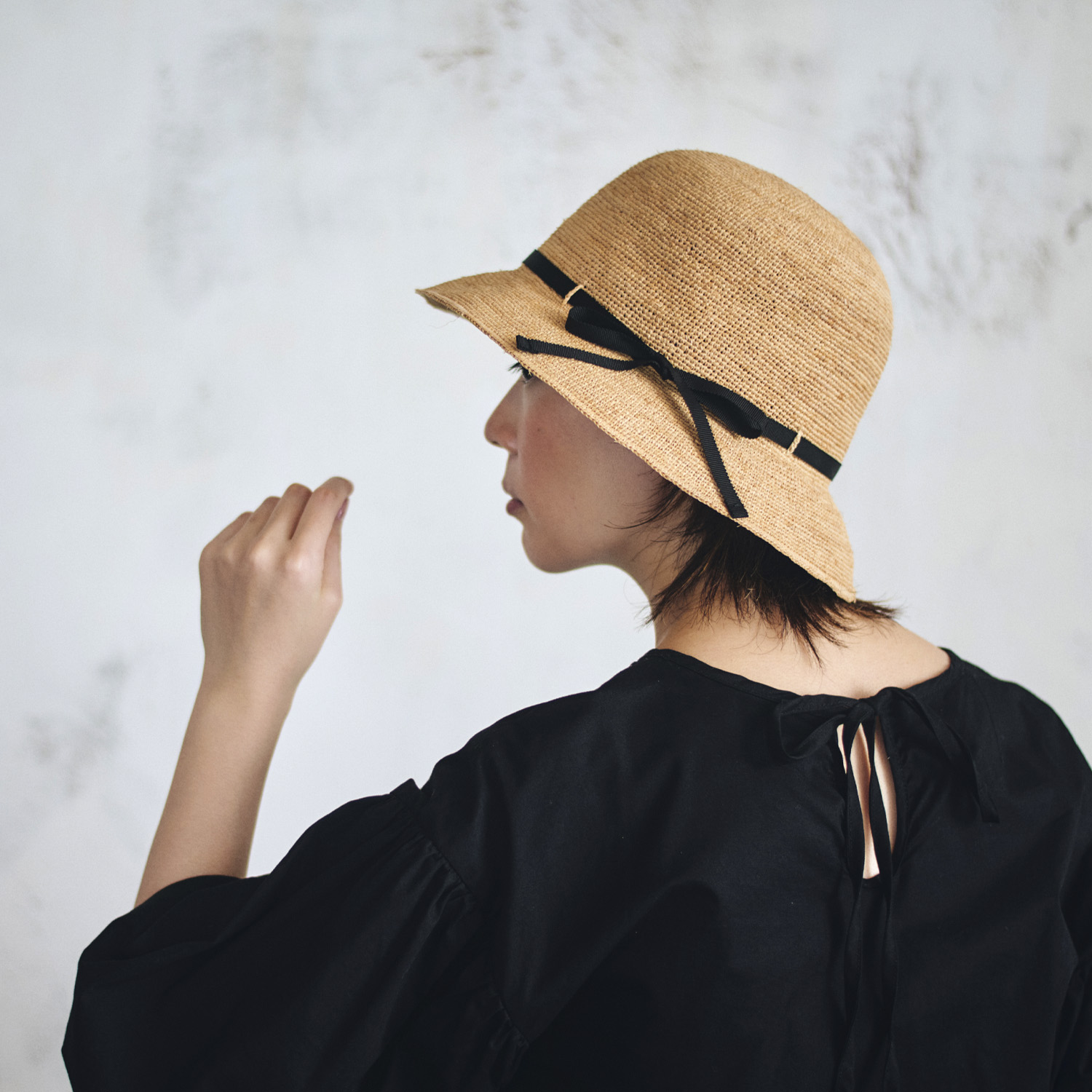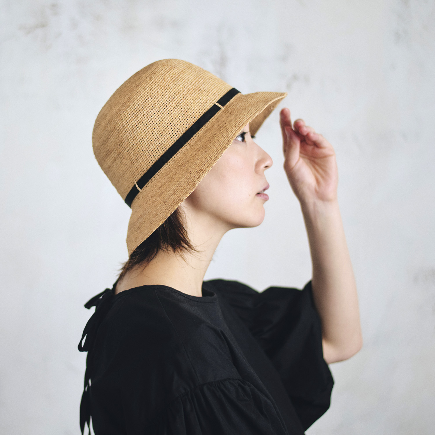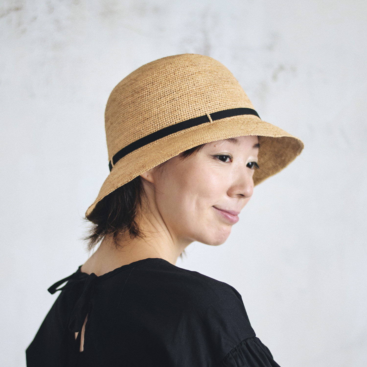 ラフィアとは、マダガスカル原産の「ラフィア椰子」の葉を加工した天然素材です。その繊維から作られる紐を編んだ素材から帽子を作っています。使うほど手に馴染み肌触りもやさしくなっていきます。