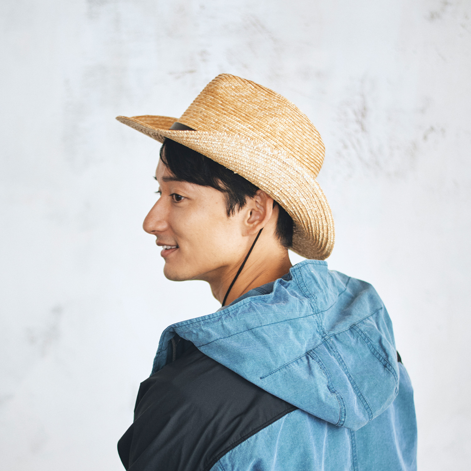 麦わら(太麦)、牛革、ポリエステル、綿紐、合金