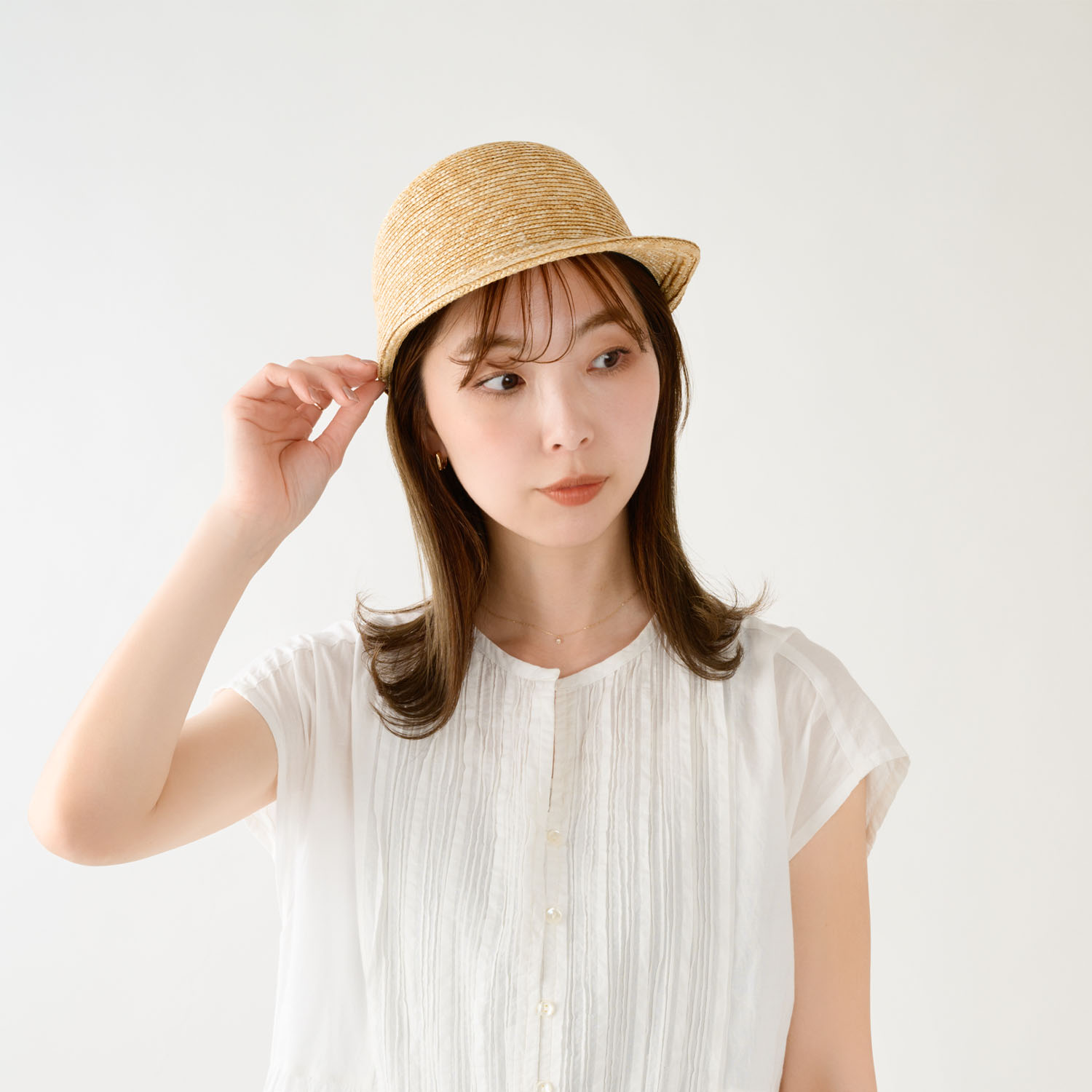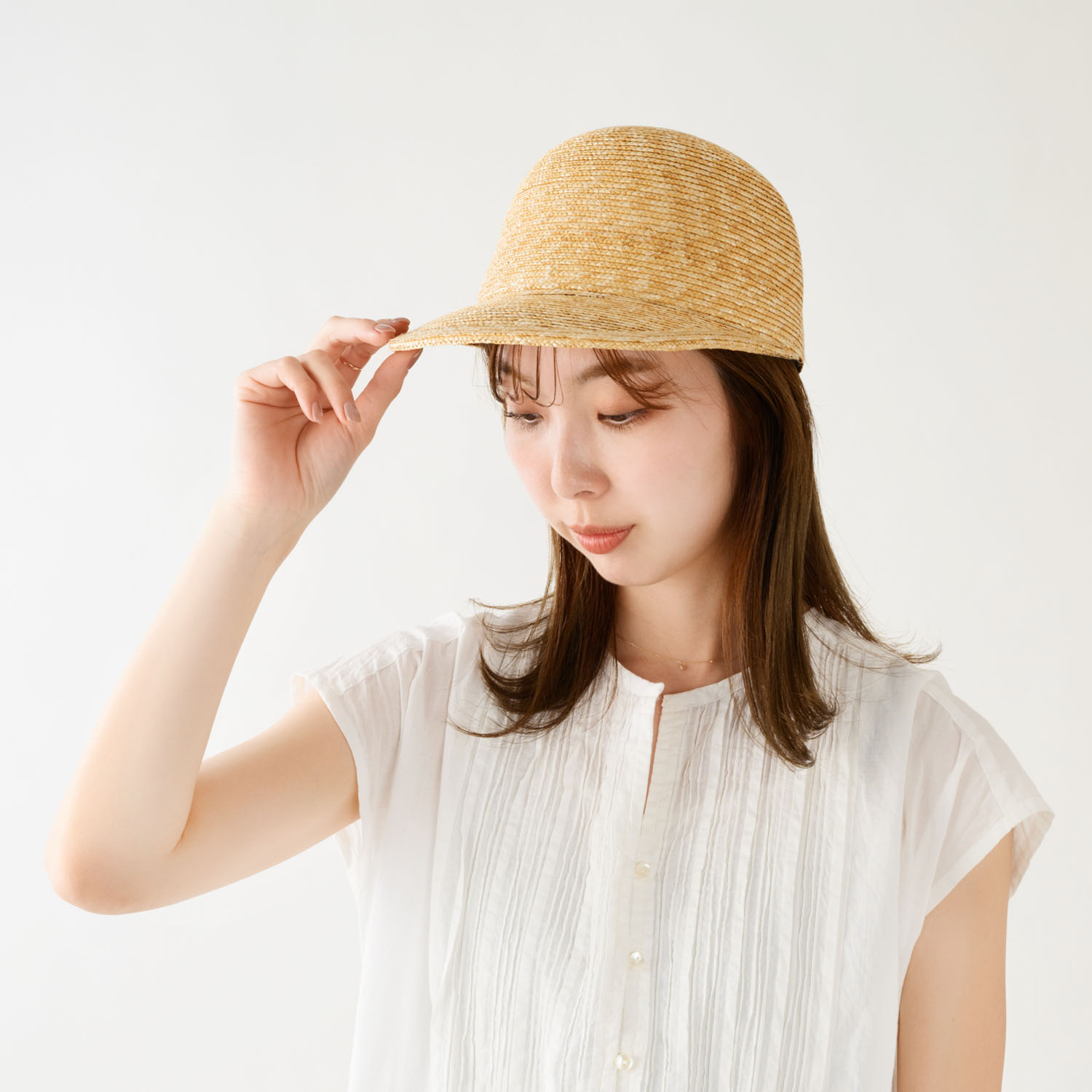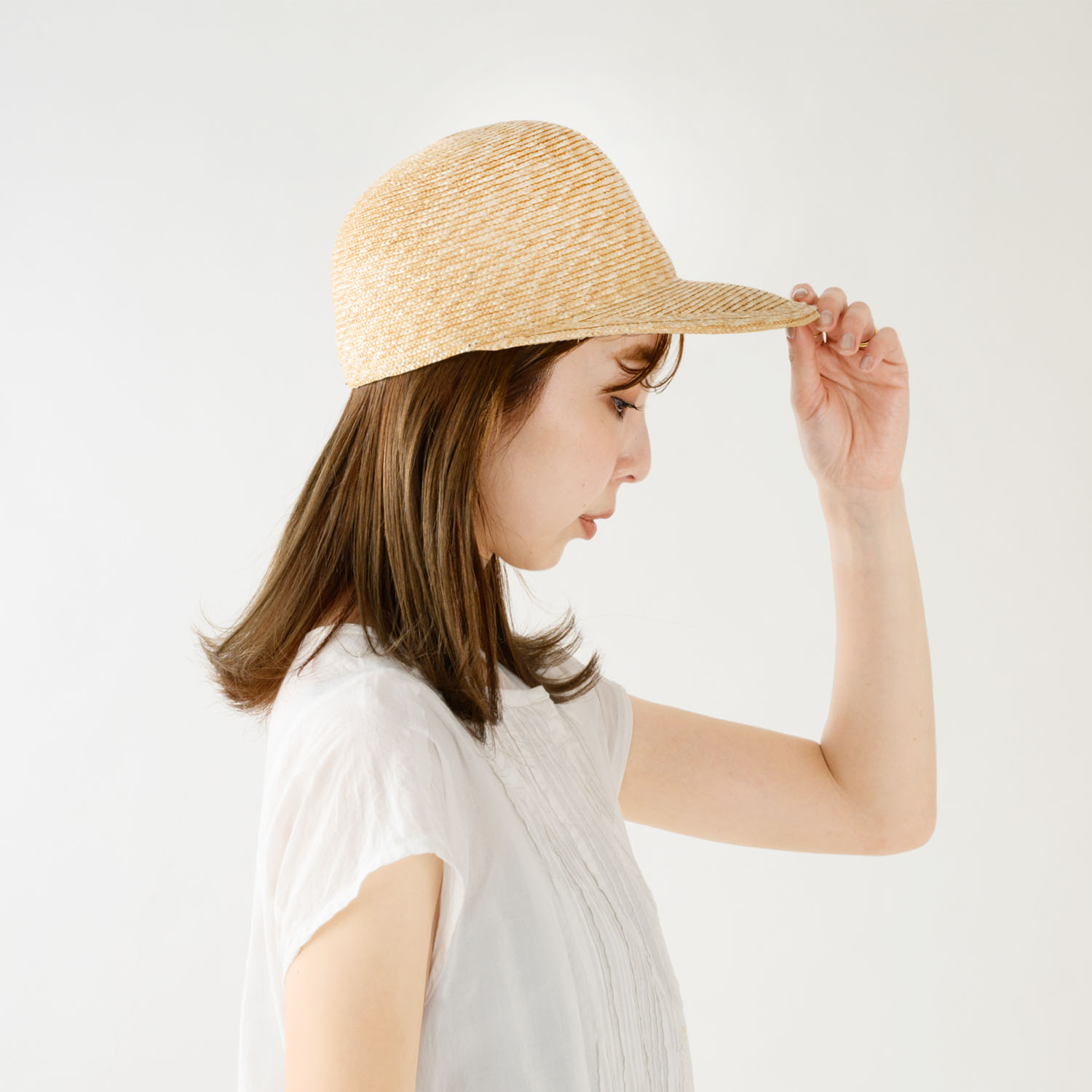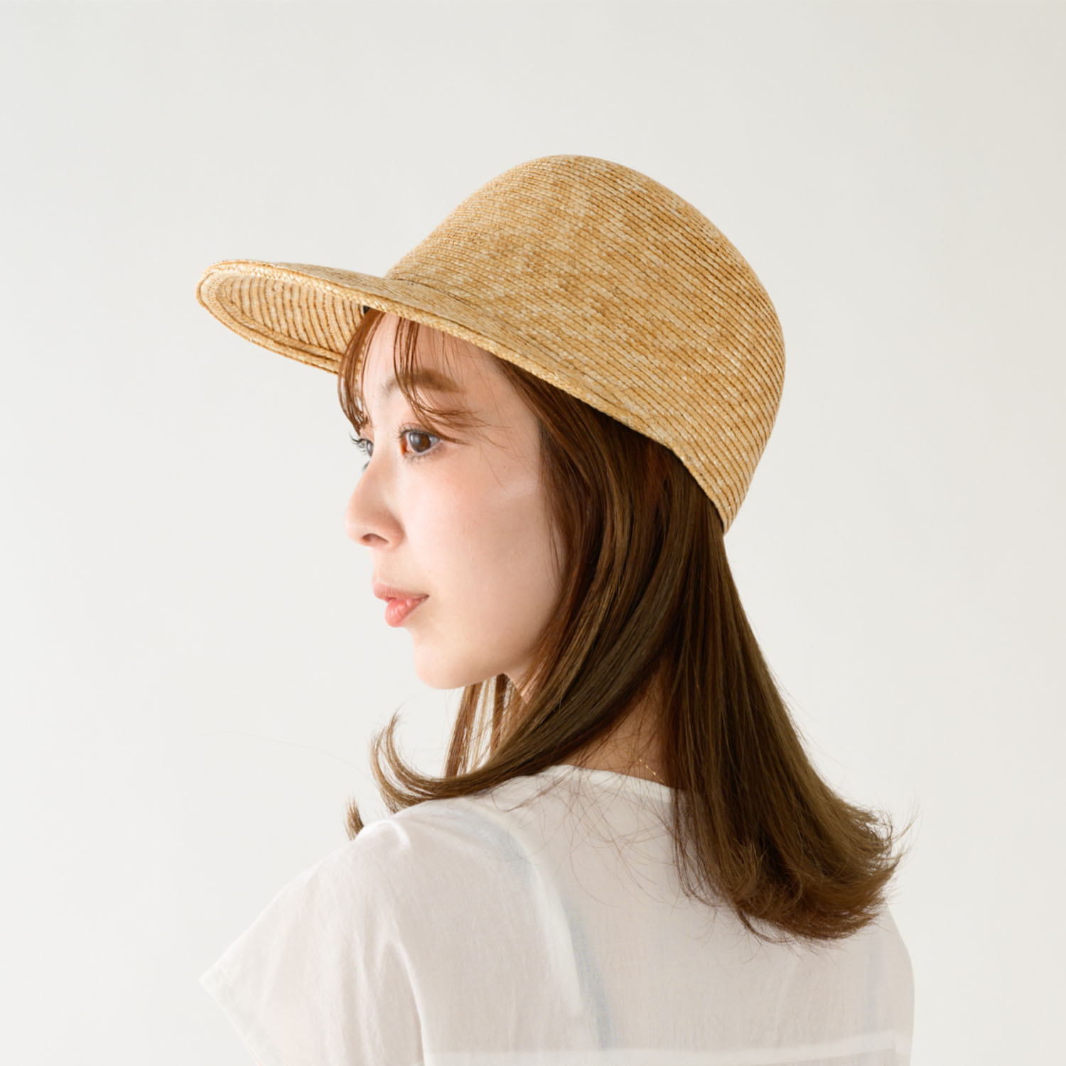 つばは少し長めで日除けに最適な長さです。カジュアルなキャップ型ながら、作りは麦わら帽子そのもので、高級感溢れる大人のキャップに仕上がっています。 つば先を少し曲げれば、フェイスラインにフィットして、よりお洒落です。