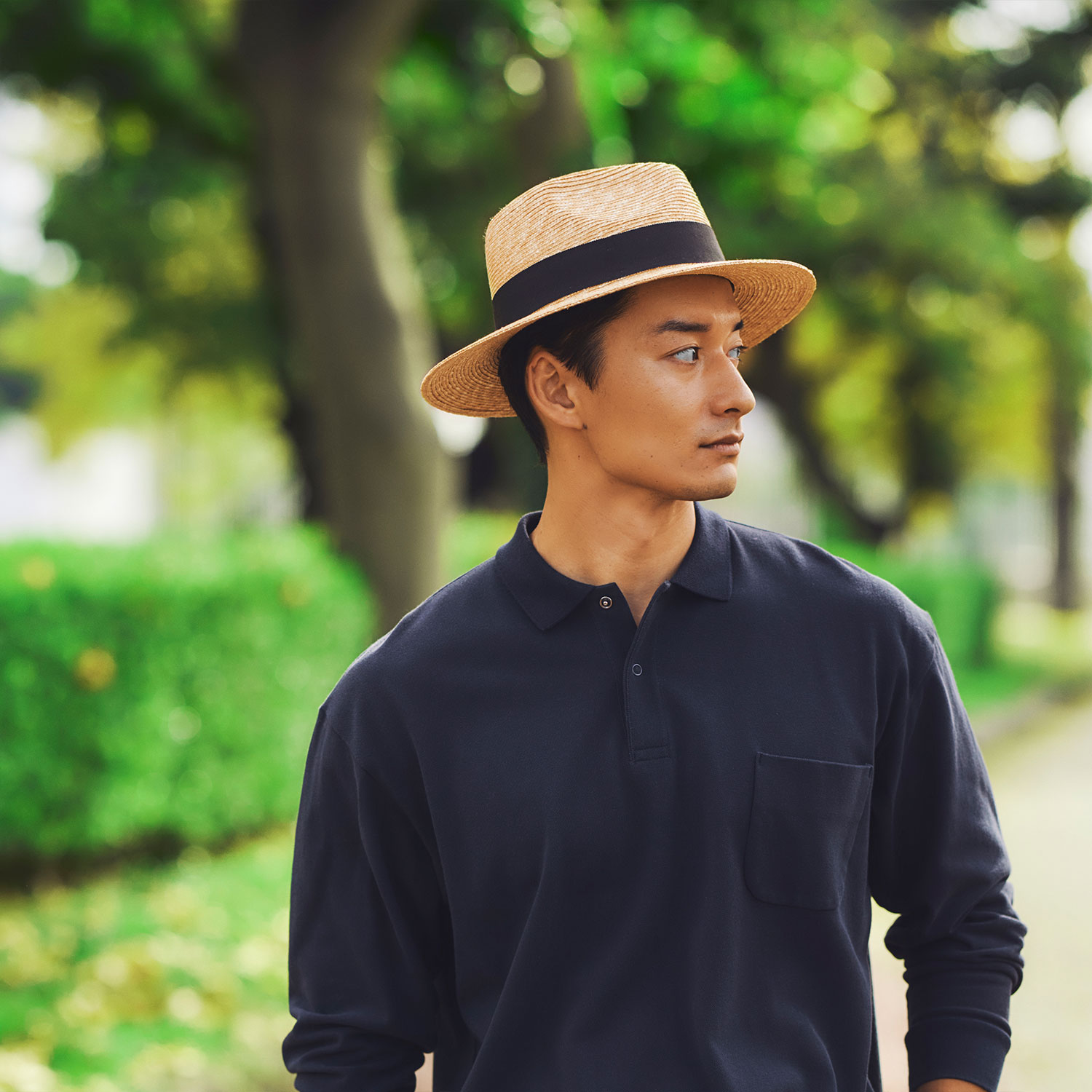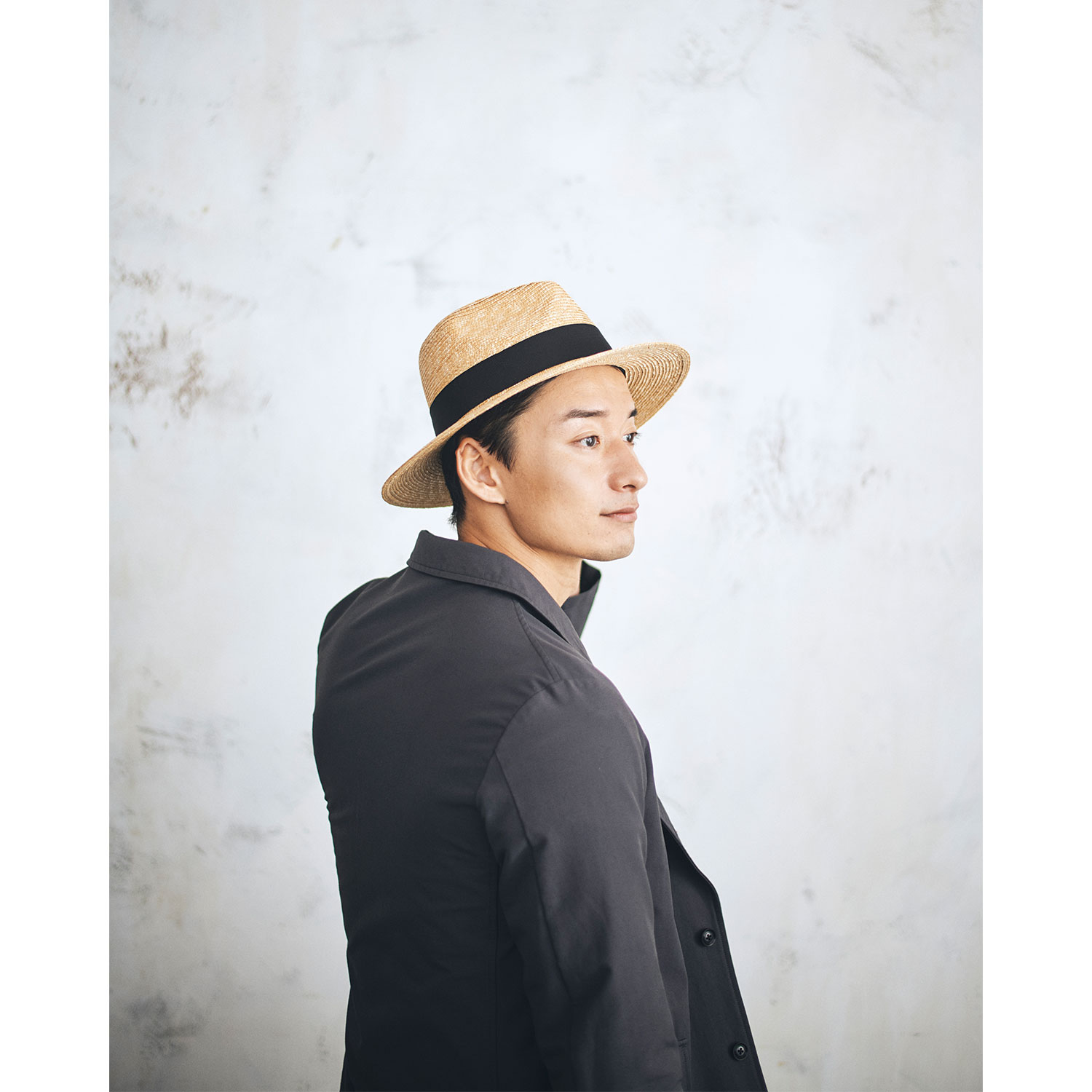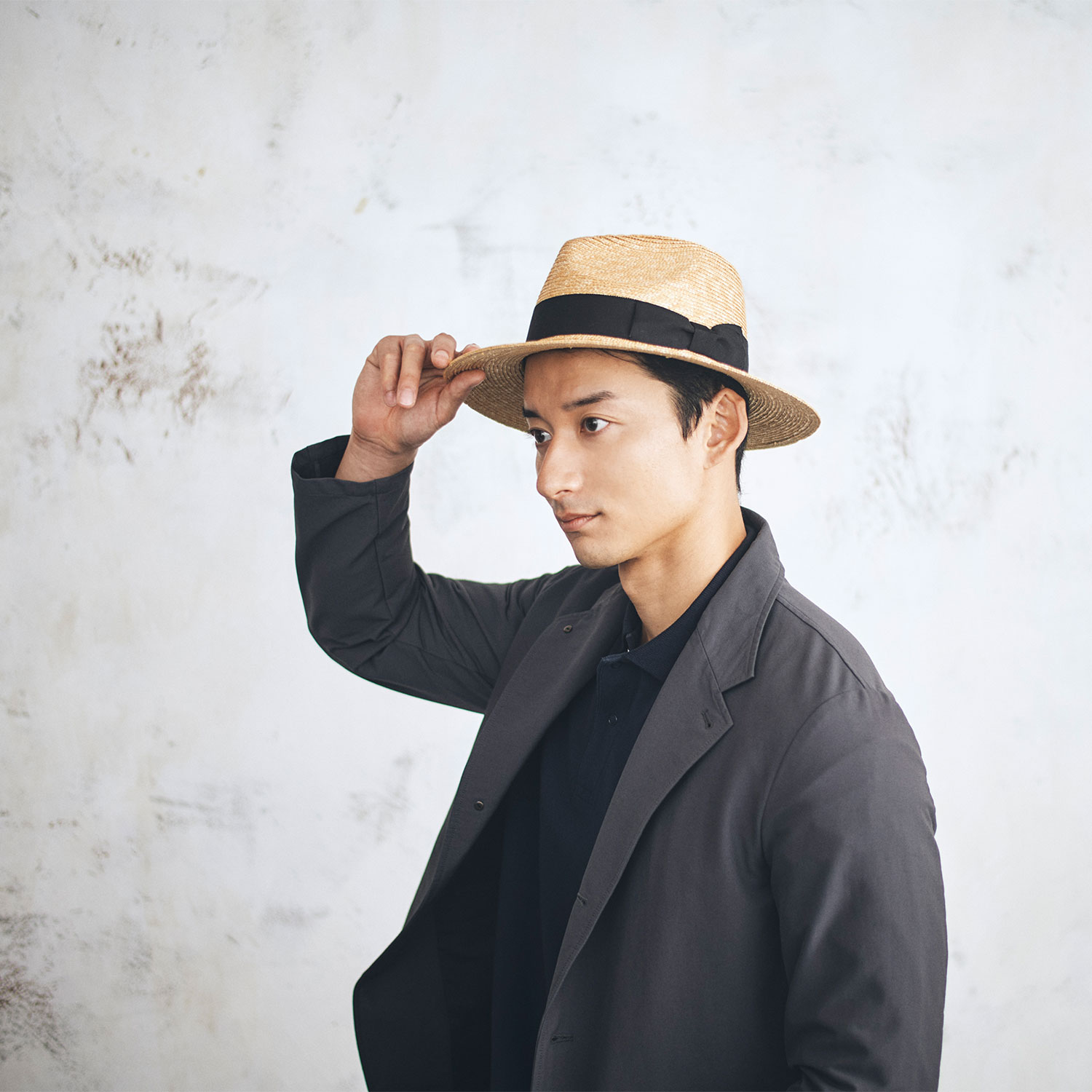 街中でかぶれる帽子で、しかもしっかりと日除けしてくれる帽子を作りました。つばが長くても格好よく見えるように細麦を使用。細く縫われた帽体はかぶり心地が良いだけでなく、見た目もエレガントです。また、太めのリボンがクラシックな感じを演出し、まさに大人の紳士帽です。