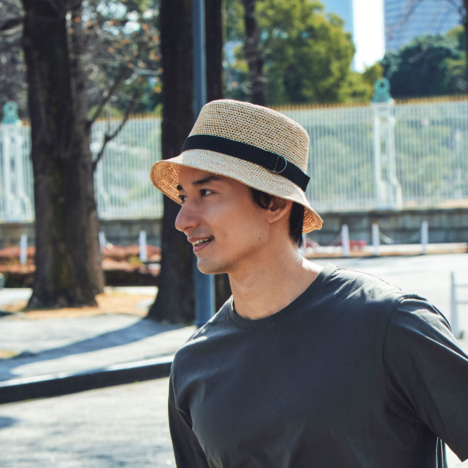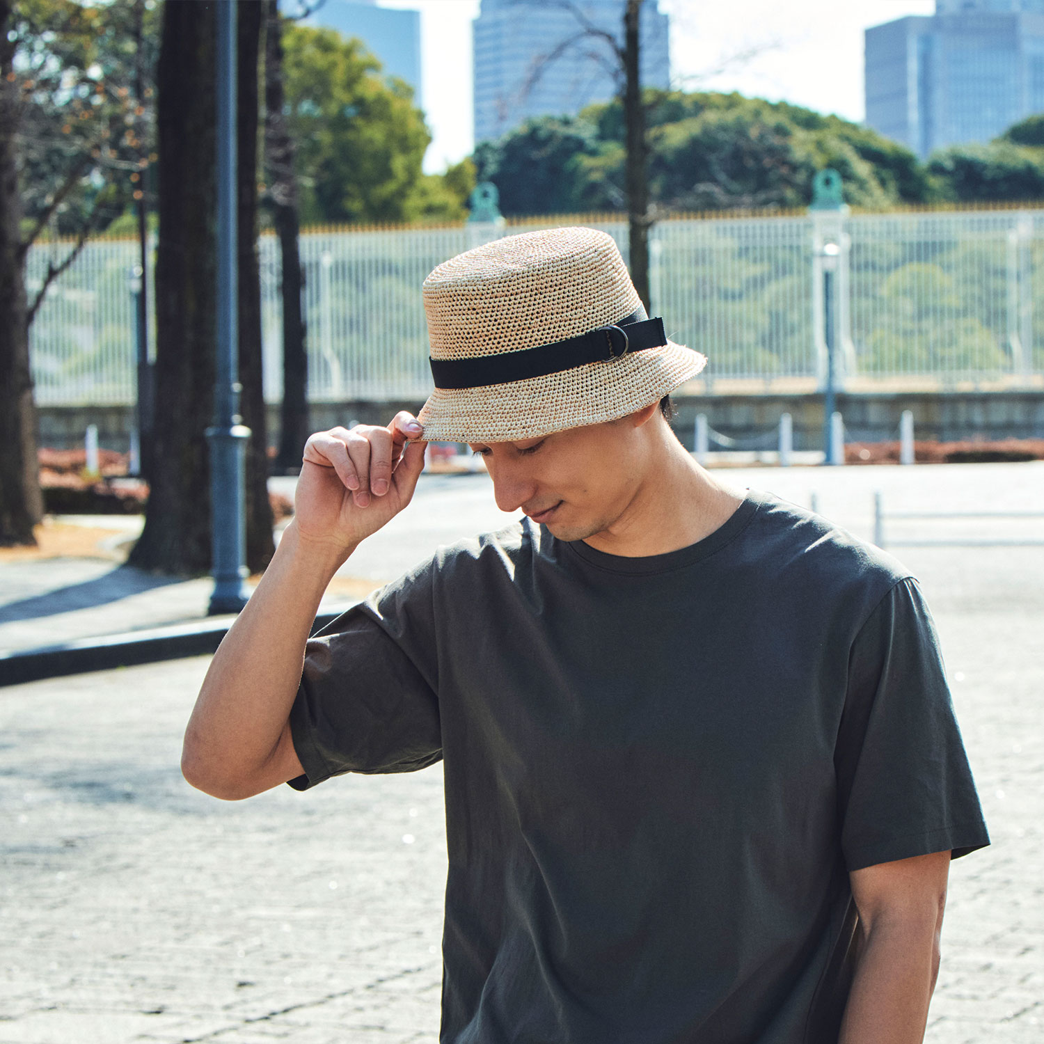 素材は、ラフィアの細編み。つばが短く、逆さにしたフォルムがバケツに似ていることから”バケットハット”と呼ばれているモデルです。